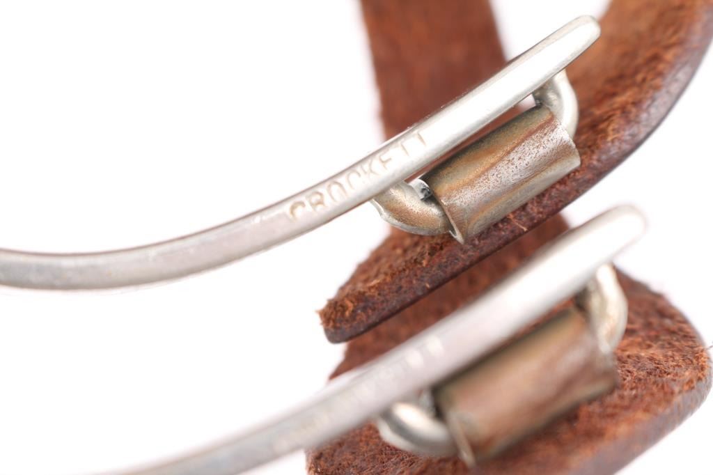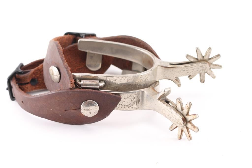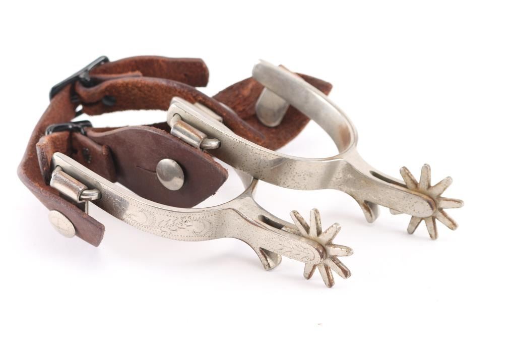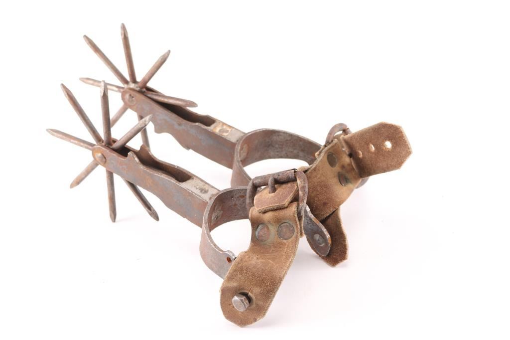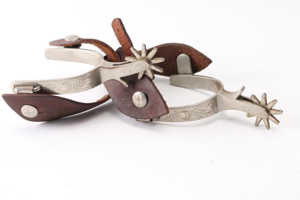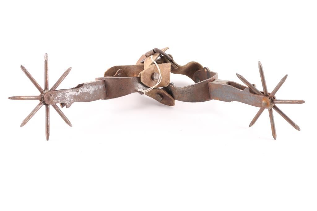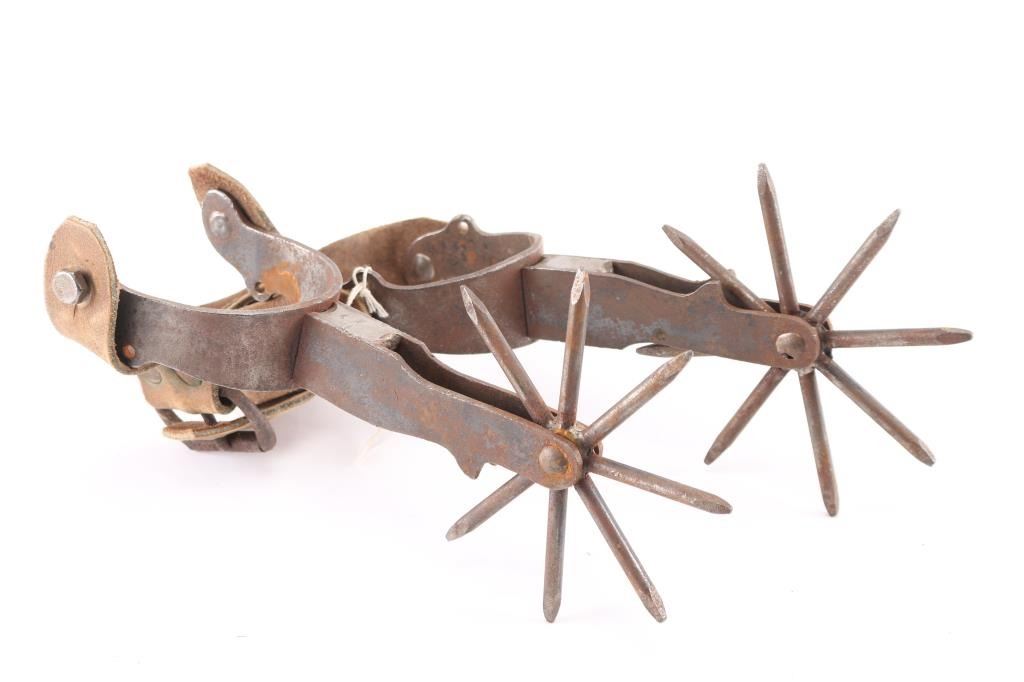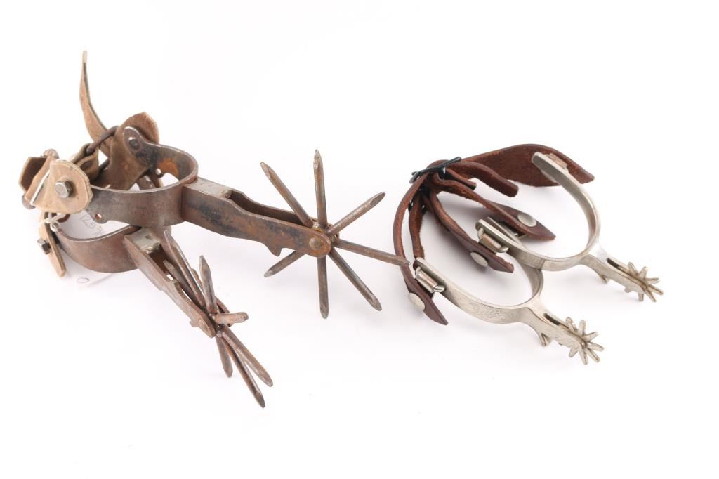 Included is a pair of Crocket spurs with leather spur straps. Also included is a pair of large Rowel novelty spurs.
