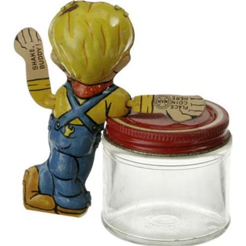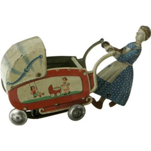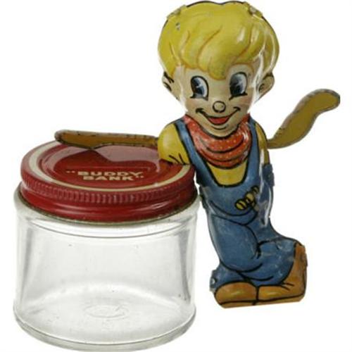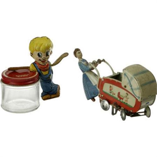 <B>Lot of Two Tin Toys Including a Marx <I>Buddy Bank</B></I></B></I> <BR>Includes a tin wind-up toy nanny pushing a baby carriage, measuring 6.5" long and 3.75" high stamped "Patent Made in U.S. Zone Germany" at front of carriage. The Marx "Buddy Bank" is a small jar with a toy boy standing alongside it with flat arms designed to slide coin into opening at top of jar when left arm is is used as a lever. <BR><B>Condition</B></I> - Overall condition of both toys is good. Neither box is present. <BR><BR><b>Shipping:</b> Miscellaneous Collectibles, Smal (<a target="_blank" href="http://www.heritageauctions.com/common/shipping.php">view shipping information</a>)