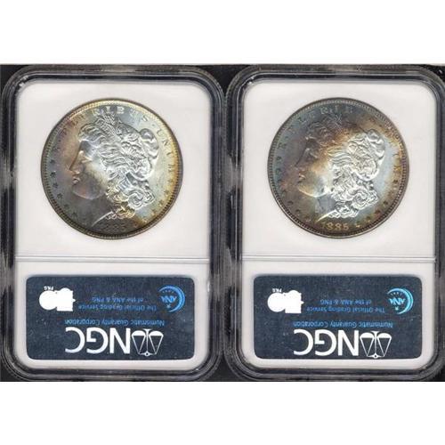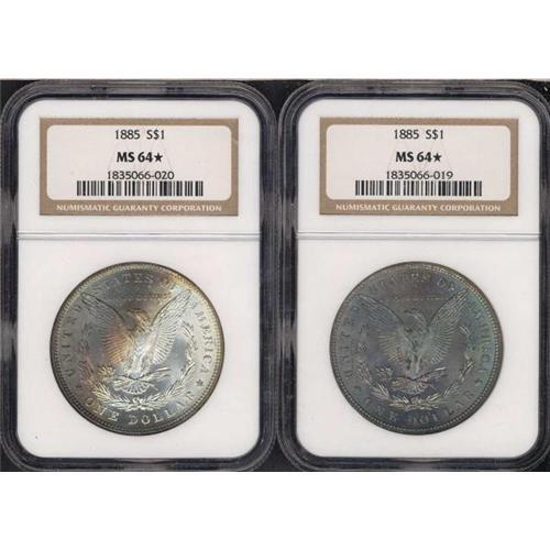 <b>Lot of Two Toned Morgan Dollars. MS64 Star Designation for Eye Appeal.</b> Includes two reverse and obverse toned 1885 NGC MS64*. Lot of 2 coins.