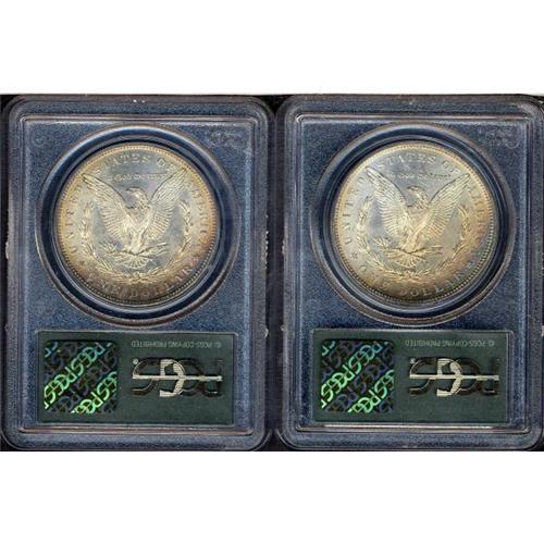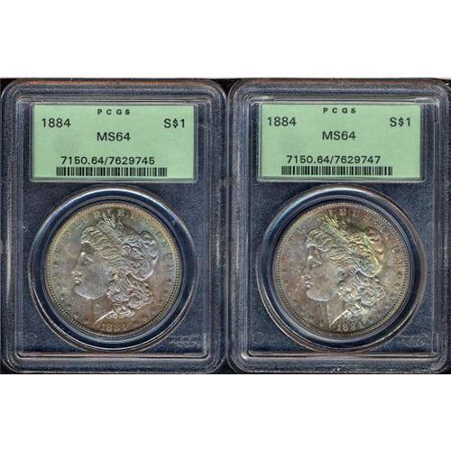 <b>Lot of Two Toned Morgan Dollars. PCGS graded MS64.</b> Includes two obverse toned 1884 PCGS MS64. Lot of 2 coins.