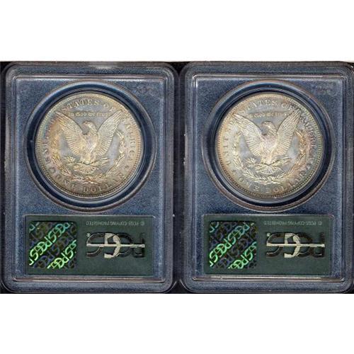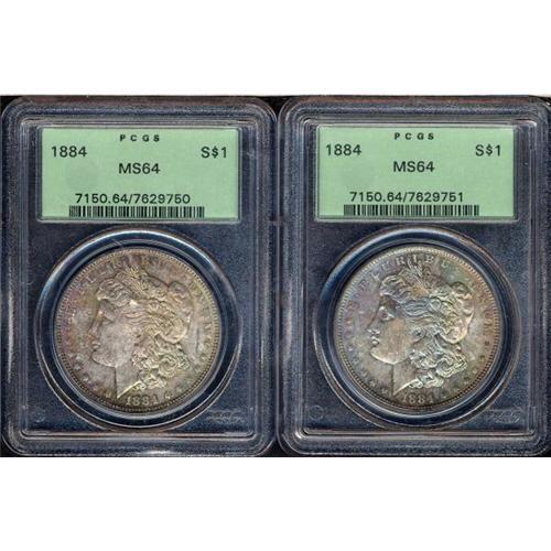 <b>Lot of Two Toned Morgan Dollars. PCGS graded MS64.</b> Includes two obverse toned 1884 PCGS MS64. Lot of 2 coins.