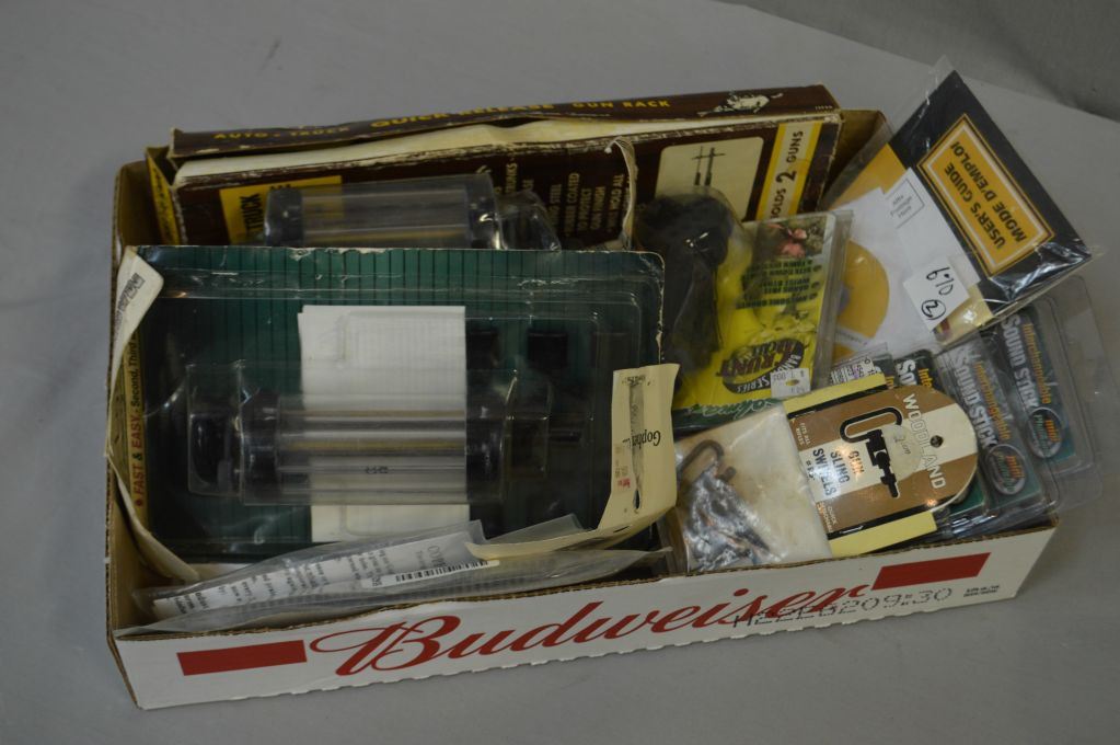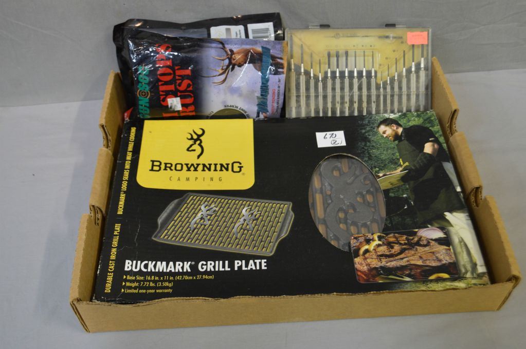 Lot of Two Trays : Browning Buck Mark Grill [ new in pkg ] - Screwdriver Kit - 2 Gun Socks [ new in pkg ] - Three EC-Loaders [ new in pkg ] - Sound Sticks [ new in pkg ] - Grunt Call [ new ] - Work Sharp Knife Sharpening Took [ new ] etc.