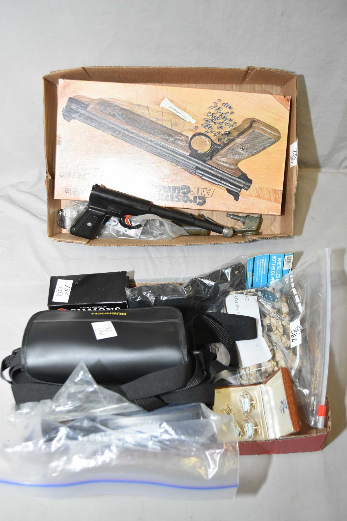 Lot of Two Trays; Crosman Model 1377 Pellet Pistol - Unknown Pellet Pistol [ NO PAL REQ ] - Unknown sight in bag - part of grenade handle - Bushnell binoculars in case - Small Simmons Binoculars in box - Trail Cam - Cased Set of Vintage Cufflinks & Tie Clip with Sail Fish Design [ cool ]