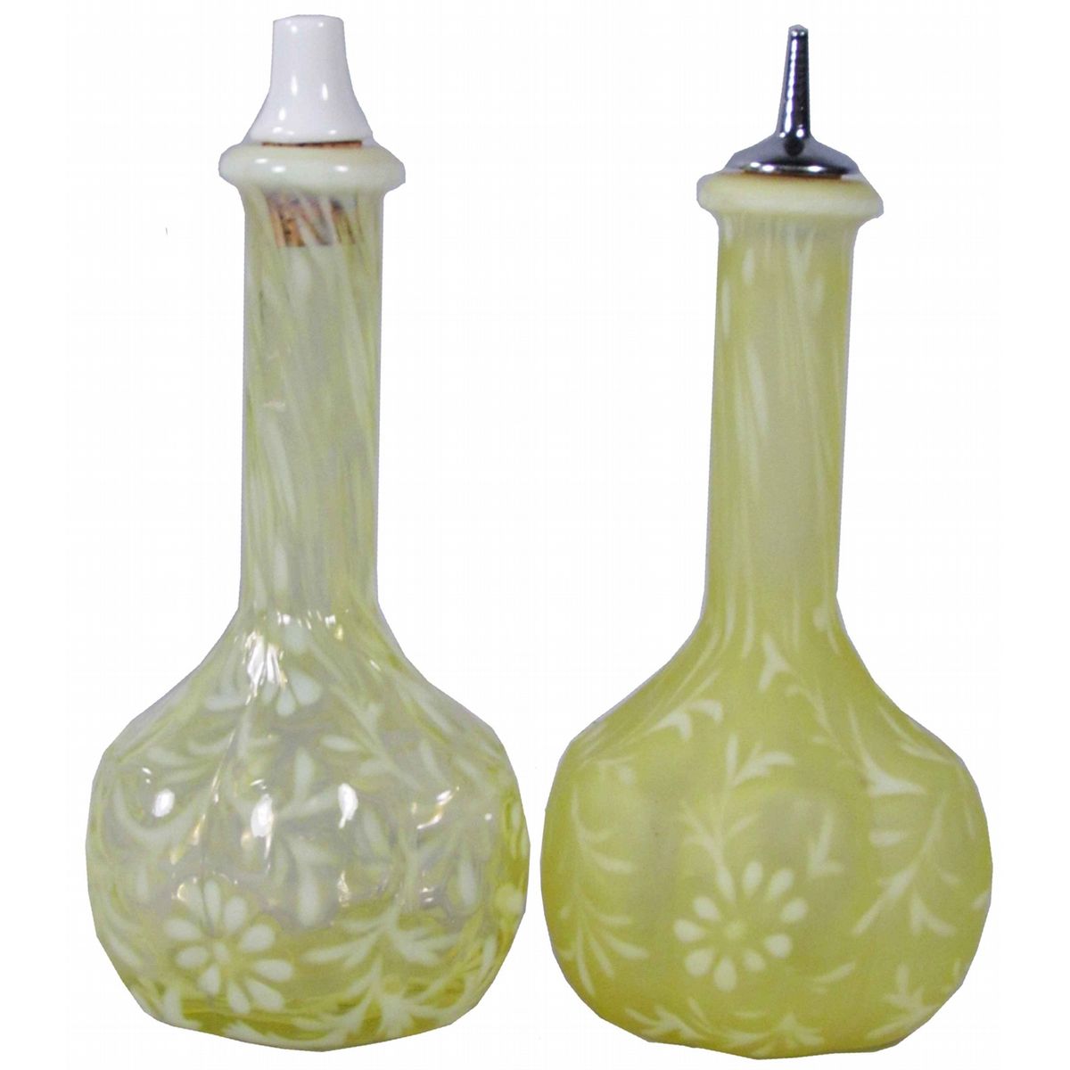 Lot of Two Vaseline and Milk Glass Barber Bottles. One frosted, one clear. No chips or cracks. 7 1/4 inches tall w/o stopper.
