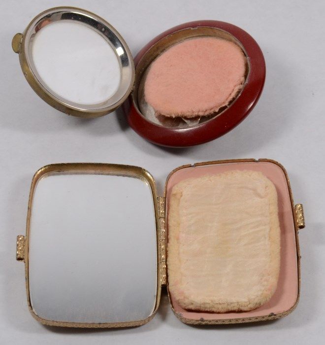The gold tone compact measures 2.75" x 2" and round compact measures 2.5" in diameter. The round compact is signed "Valaze" Est. Value $35-$40
