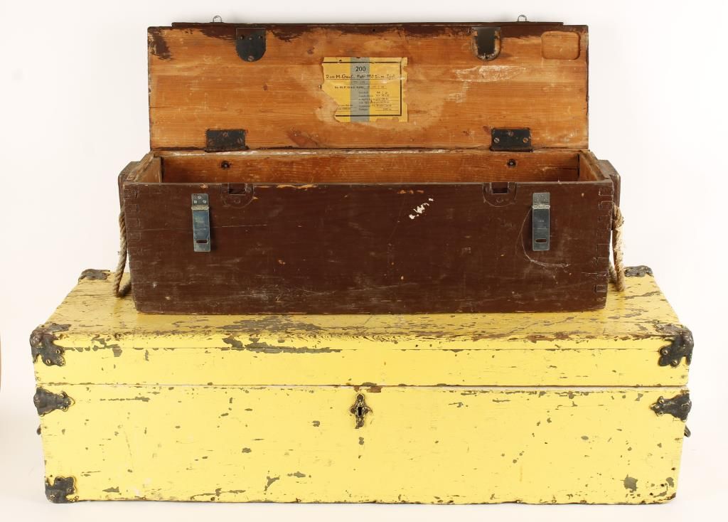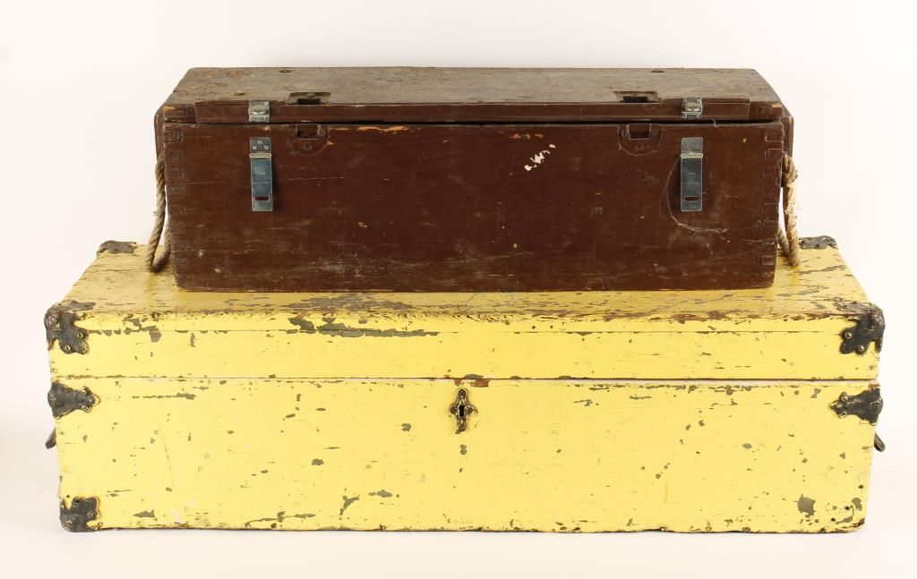 28-3/4" by 8" by 8-3/4" for the small one which is a German ammunition chest for aircraft machine gun. The large one is 36" by 10-1/4" by 11-1/2" with metal corners (two are missing) and handles. This box is locked and we have no key for it.