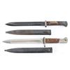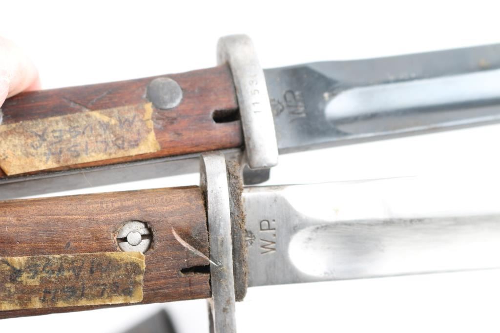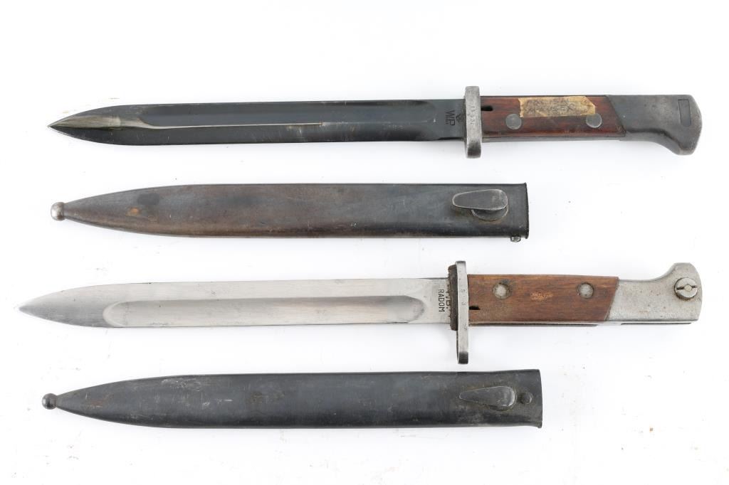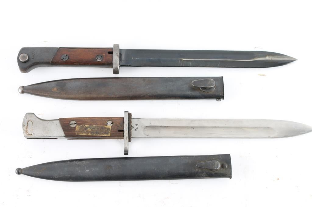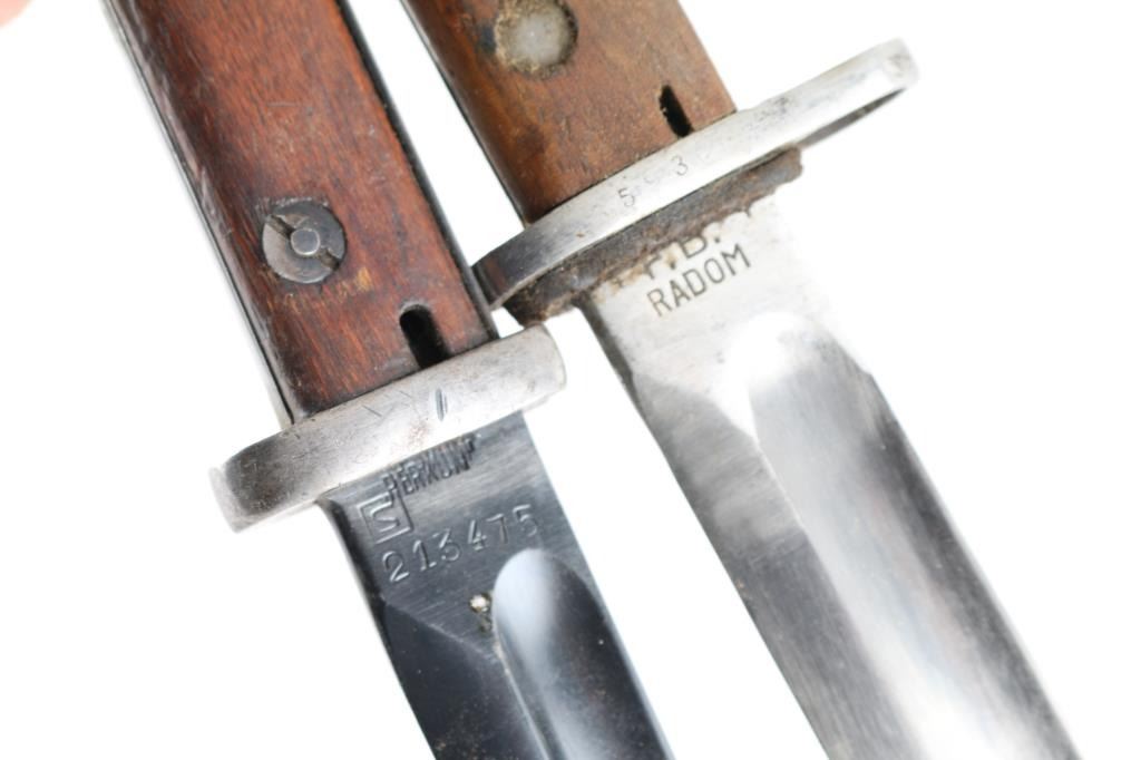 1) marked "FB RADOM" and eagle over "WP", very good condition with steel sheath, scales are very good. Sheath is missing the spring retainer. 2) marked "PERKUN" and "S" in box, eagle over "WB", "213475" on blade, "1153" on steel sheath and on guard, no muzzle ring, possibly reworked to fit a K98k. Very good condition, blued finish.