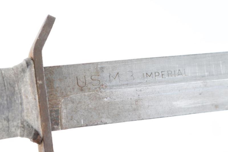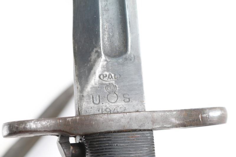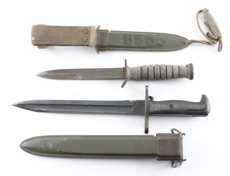 1) U.S. WW2 M1 Garand Bayonet. 10" blade. Ricasso stamped "PAL" "U.S." with flaming bomb and "1942 .Scabbard marked "U.S." inside flaming bomb. Very Good Condition. 2) U.S. WW2 M3 fighting knife. Produced 1943/44. Maker Imperial. 6 3/4" blade marked U.S. M3 Imperial".Stacked leather grips. Comes in correct U.S. M8 scabbard made by "B.M. Co.". Overall good condition with the blade having some minor pitting near the tip. Needs a good cleaning.