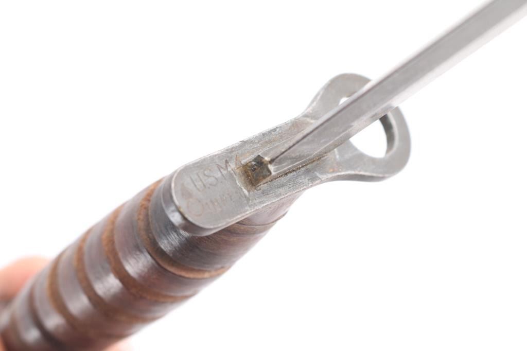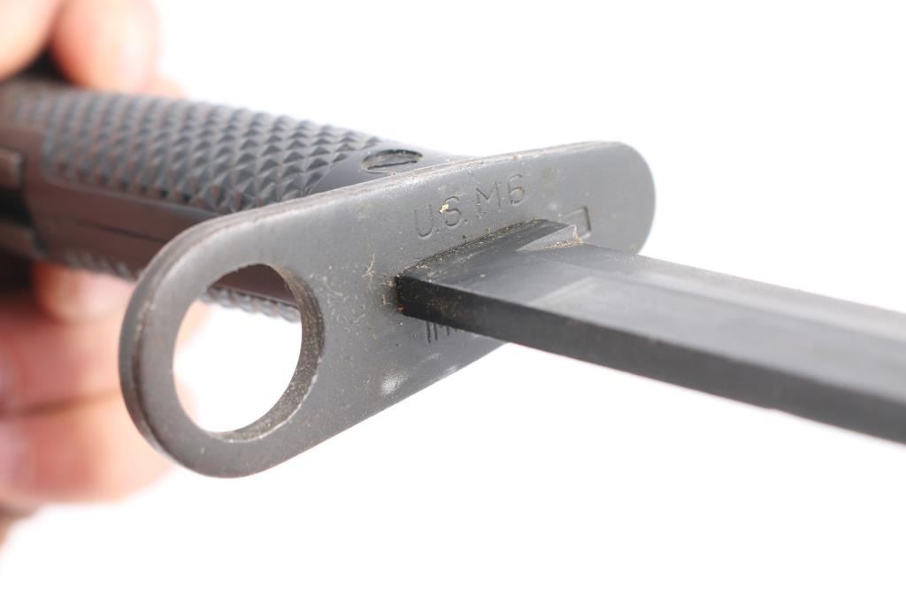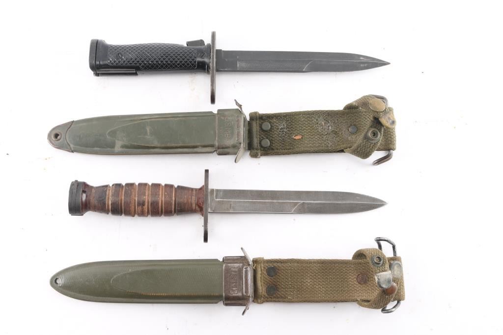 Two Total. 1) WWII US-M4 Imperial Bayonet for M-1 Carbine USM8A1 PWH Scabbard. Underside of crossguard stamped "U.S. M4, Imperial" with flaming ordnance bomb. 6 1/2" blade, stacked leather grip. Overall very good condition. 2) U.S. M6 Imperial bayonet for use with the M14 rifle, Vietnam era, USM8A1 'PWH' scabbard. Very good condition.