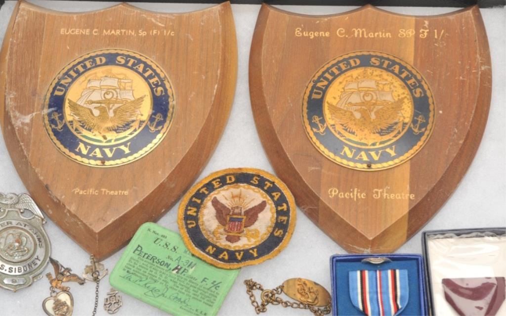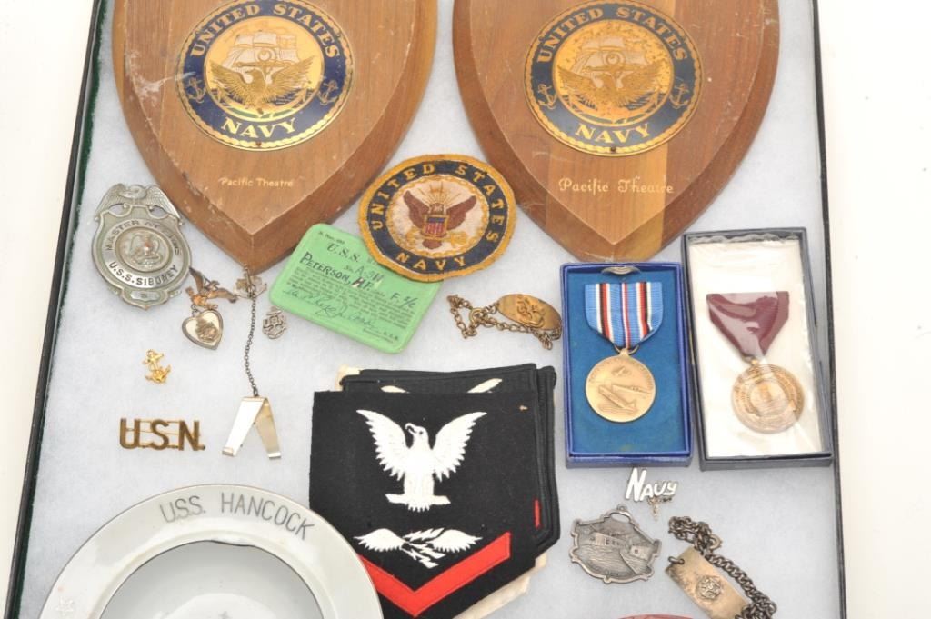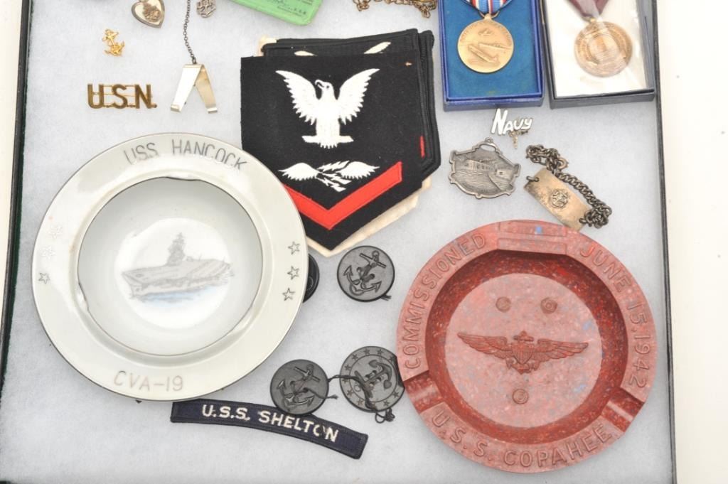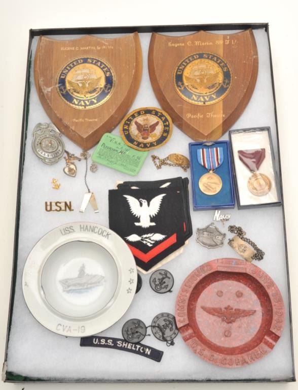 Lot of U.S. Naval memorabilia in large riker case including 2 U.S.N. Pacific Theater plaques fo Eurgene C. Martin, Sp (F) 1/c; a sterling ID bracelet inscribed to Richard C. Palmer of Stoneham, Mass; Naval Veteran’s FOB with Monitor and Merrimac; marked USN pin (sterling) with heart; 2 sterling Navy pins; 2 Naval medals in boxes, 5 patches, ashtray from CVA-19/USS Hancock; another ashtray marked U.S.S. Copahee/Commissioned June 15,1942; 4 peacoat buttons; Master At Arms badge for the U.S.S. Siboney and more. Est.: $125-$250.