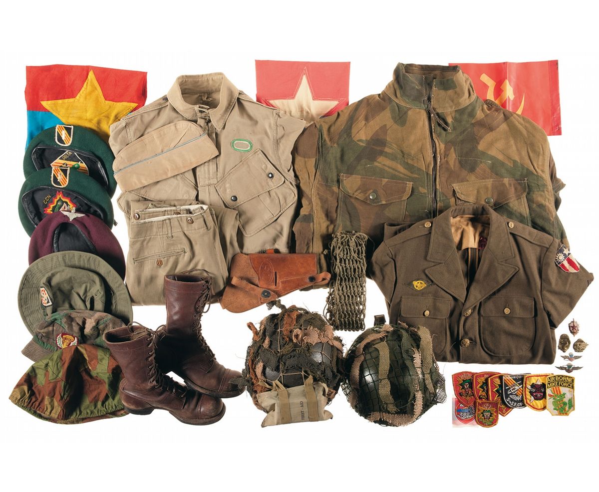 1) One U.S. M1 Airborne helmet with liner, camouflage net, camouflage and First Aid packet. Two stenciled spades (506th), one on each side, a leadership stripe and a lieutenants bar. -2) U.S. Airborne M 42 jump jacket and trousers. -3) One khaki garrison cap. -4) One leather shoulder holster stamped "U.S." and U.S./ENGER-KRESS". -5) Two Vietnam era wool green berets with second lieutenant insignia and unit patches. -6) Two boonie hats, one khaki, one camouflage with unit patches. -7) One pair of U.S. brown leather jump boots. -8) One WW II wool U.S. Army uniform jacket with rank and unit patches. -9) One maroon wool British paratrooper beret with a metal airborne badge. -10) One British paratrooper helmet with camouflage net and camouflage. -11) One camouflage British paratrooper jump smock. -12) Two khaki cord net sections, purpose unknown. -13) Eight Vietnam era unit patches, five assorted military pins, three Russian, two U.S. and three assorted guidons one of which is vinyl with a hammer and sickle. Overall good to very good.