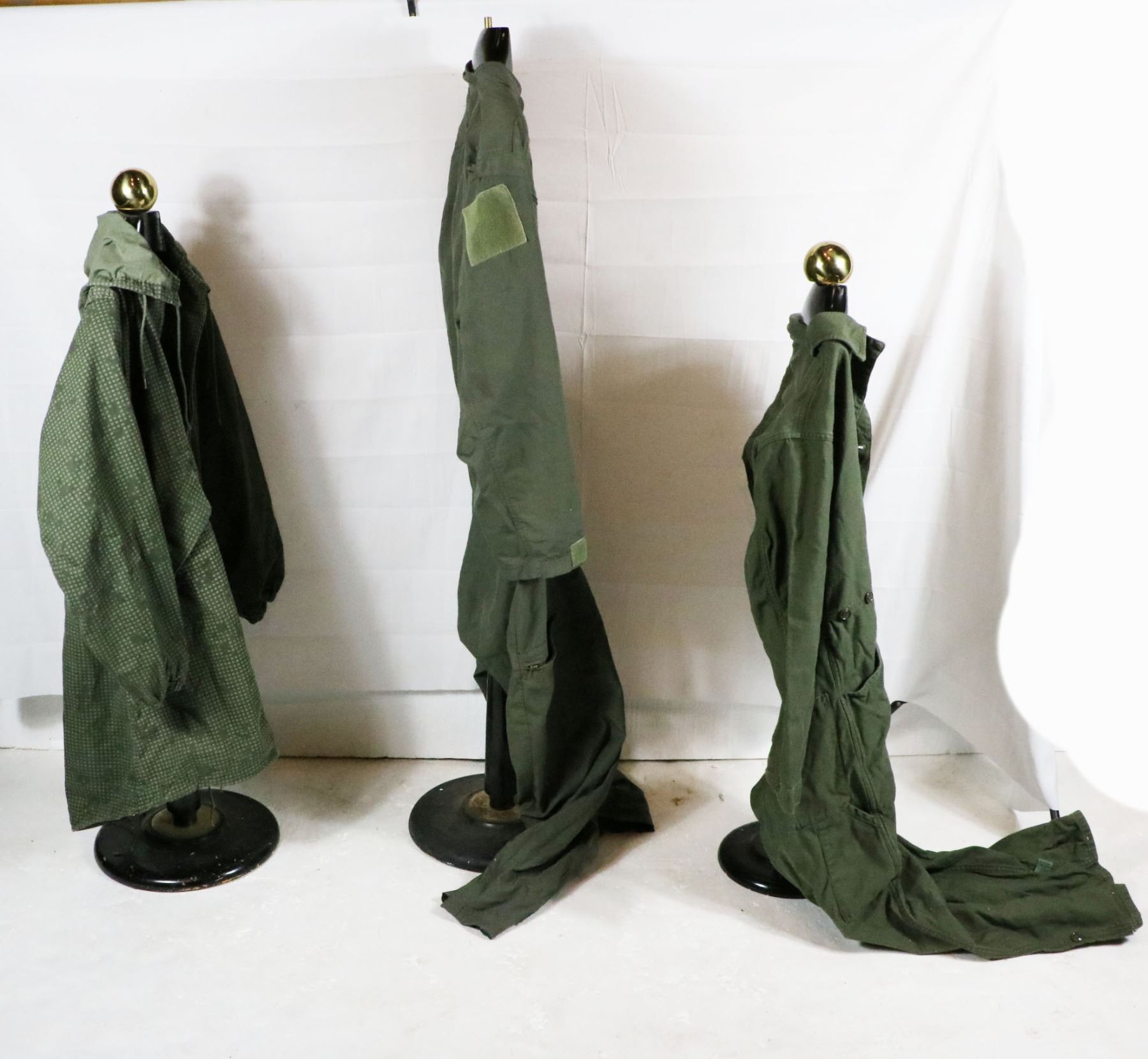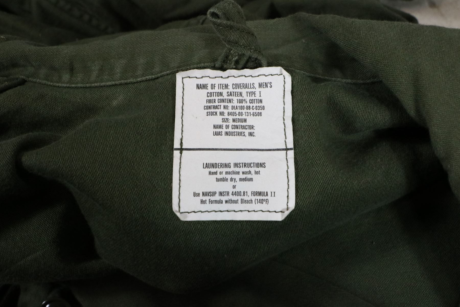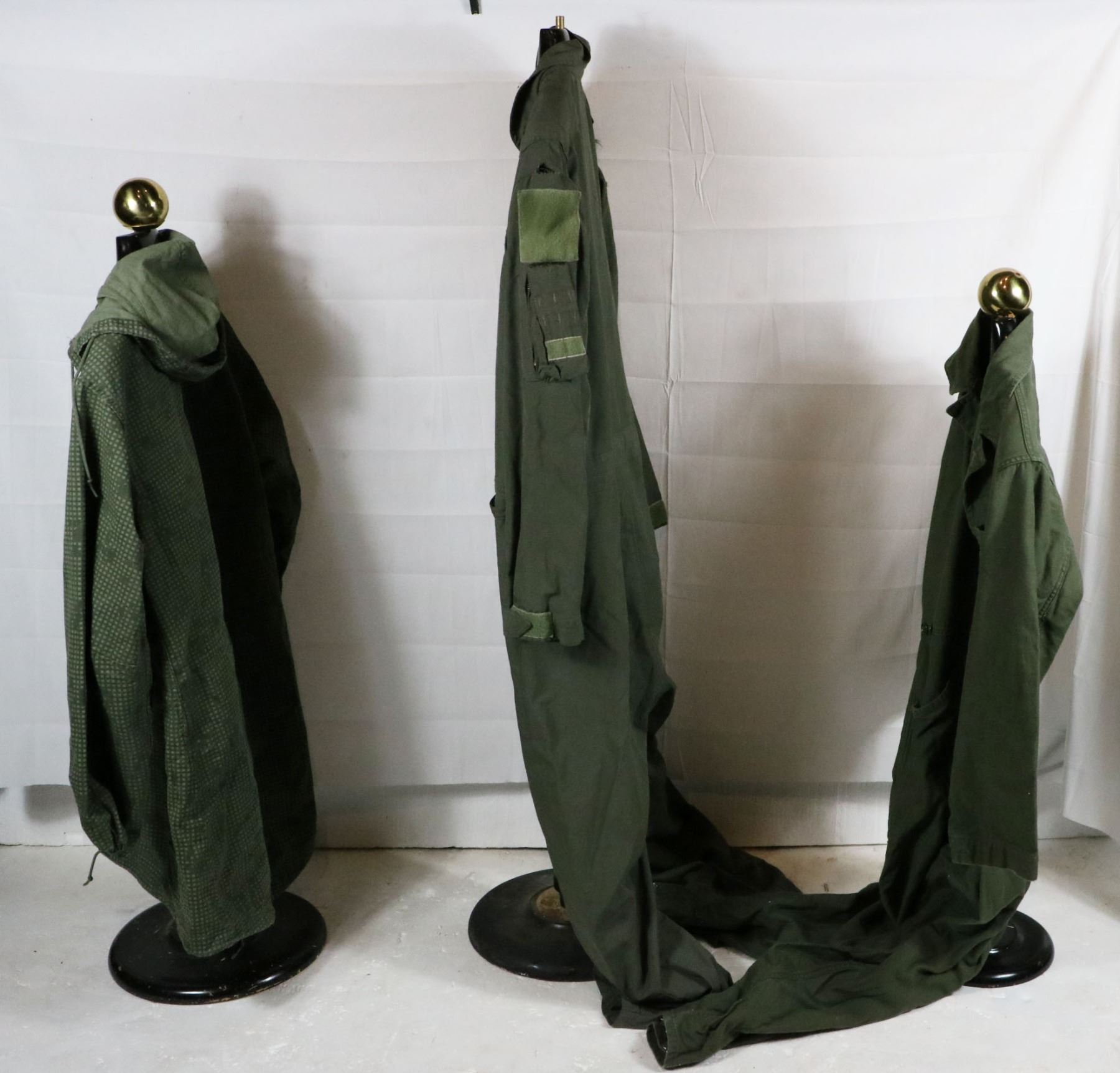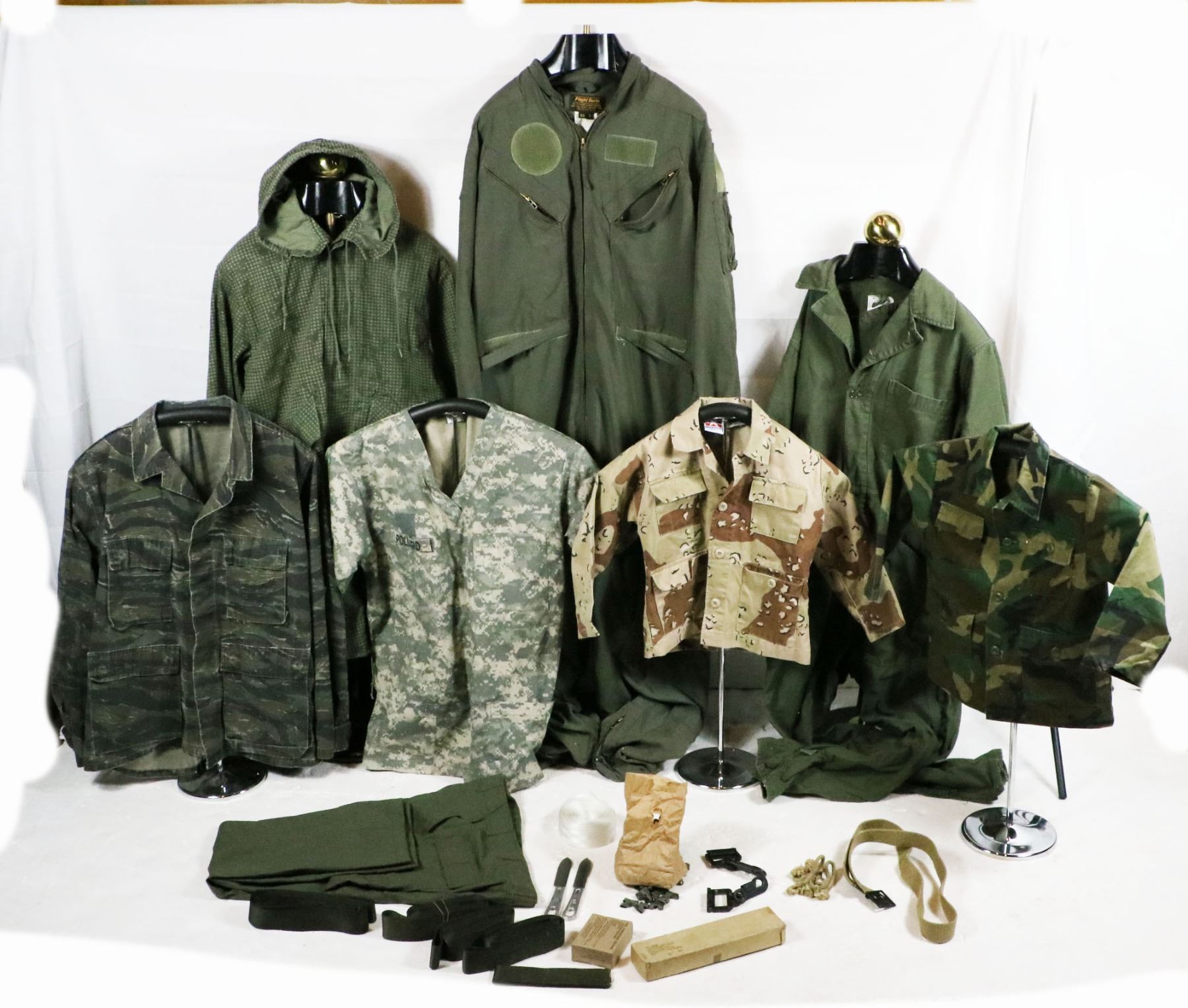 Lot of US military clothing and other items. Includes 2 coveralls, 1 desert night parka, small coat, and 3 children's T-shirts for clothing with straps, machine gun links, and two original US boxes for a M7A3 grenade launcher and ration heating. Ration box has heating items wrapped while the grenade launcher box is empty. All appear to be used. Sizes and condition vary.