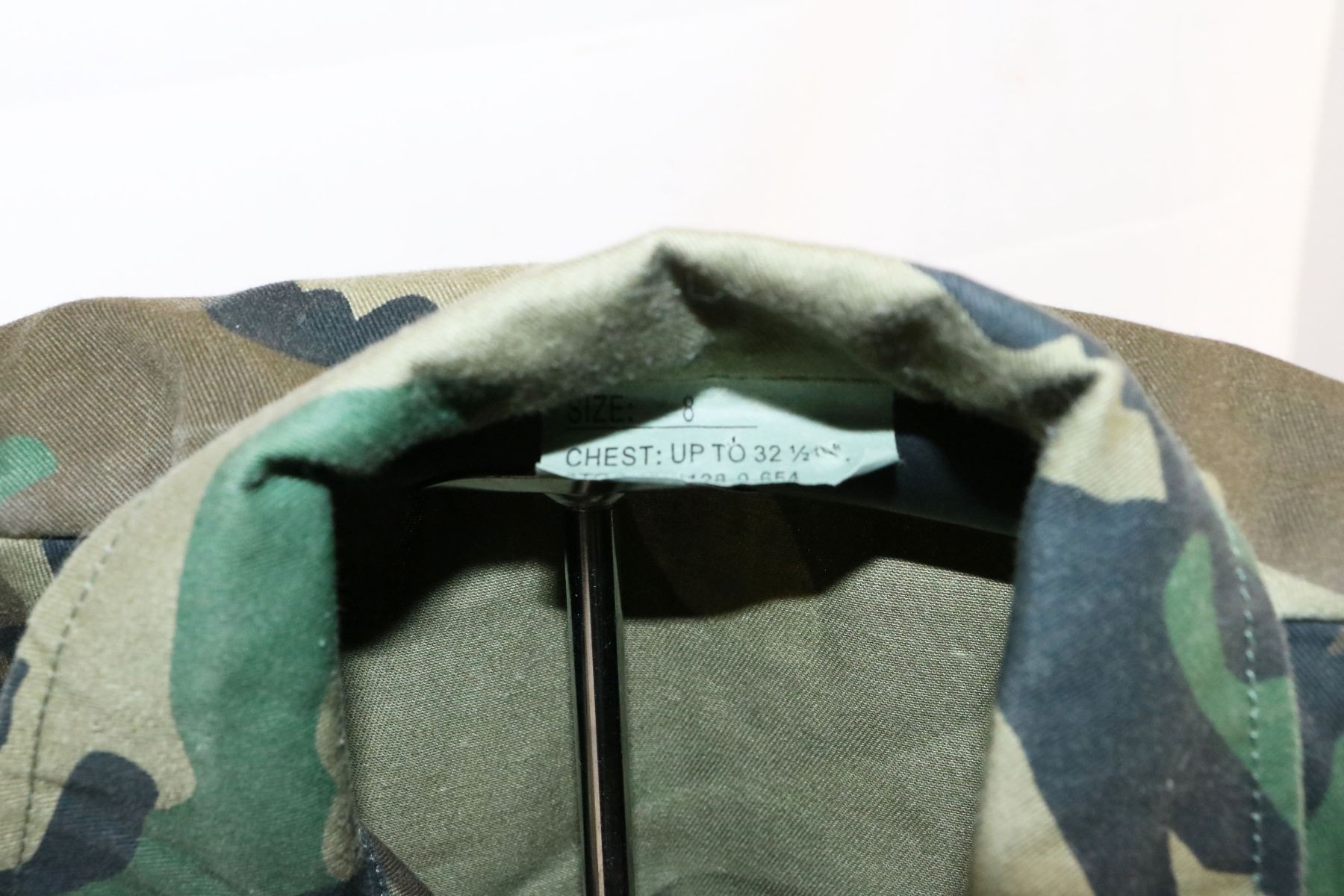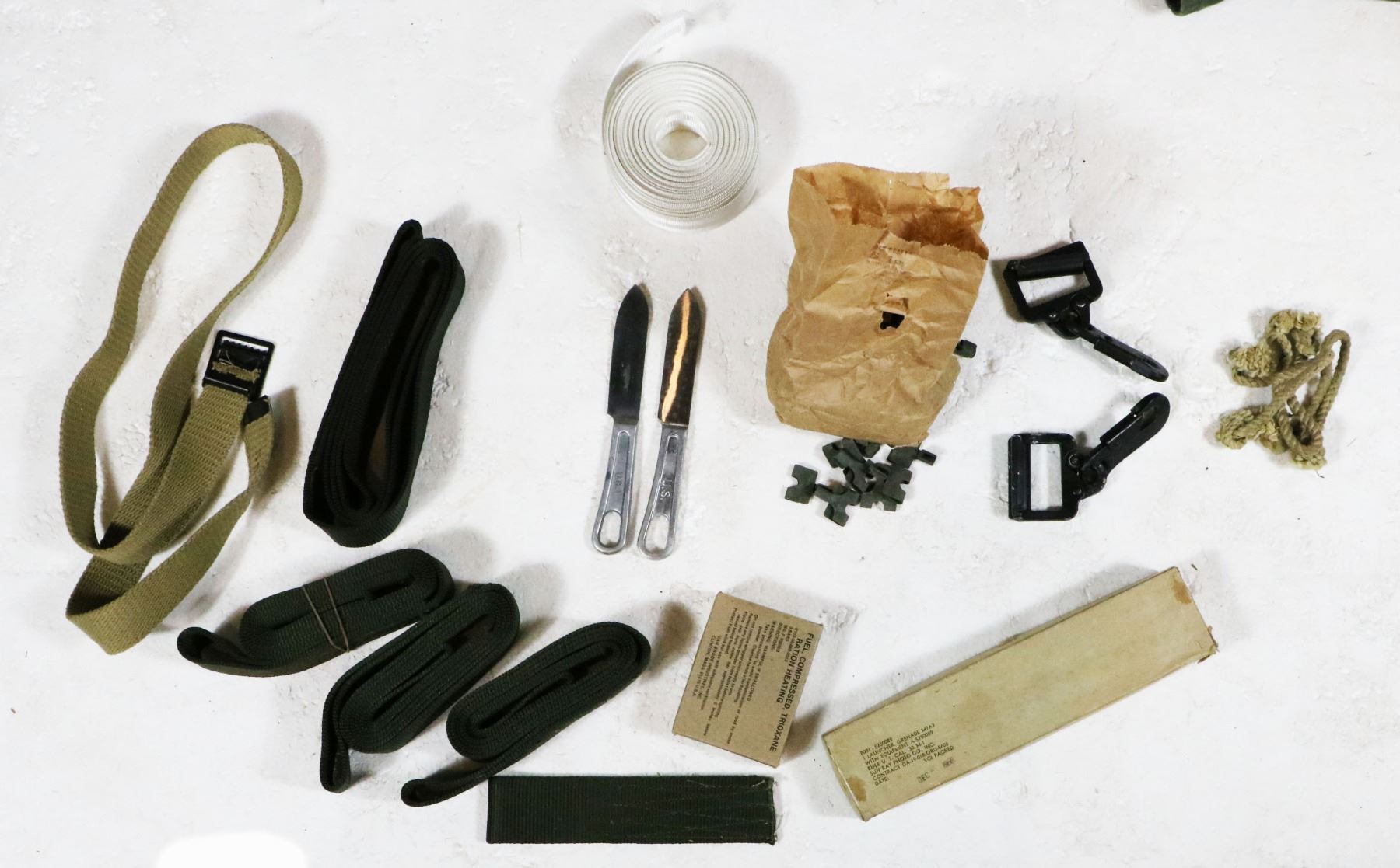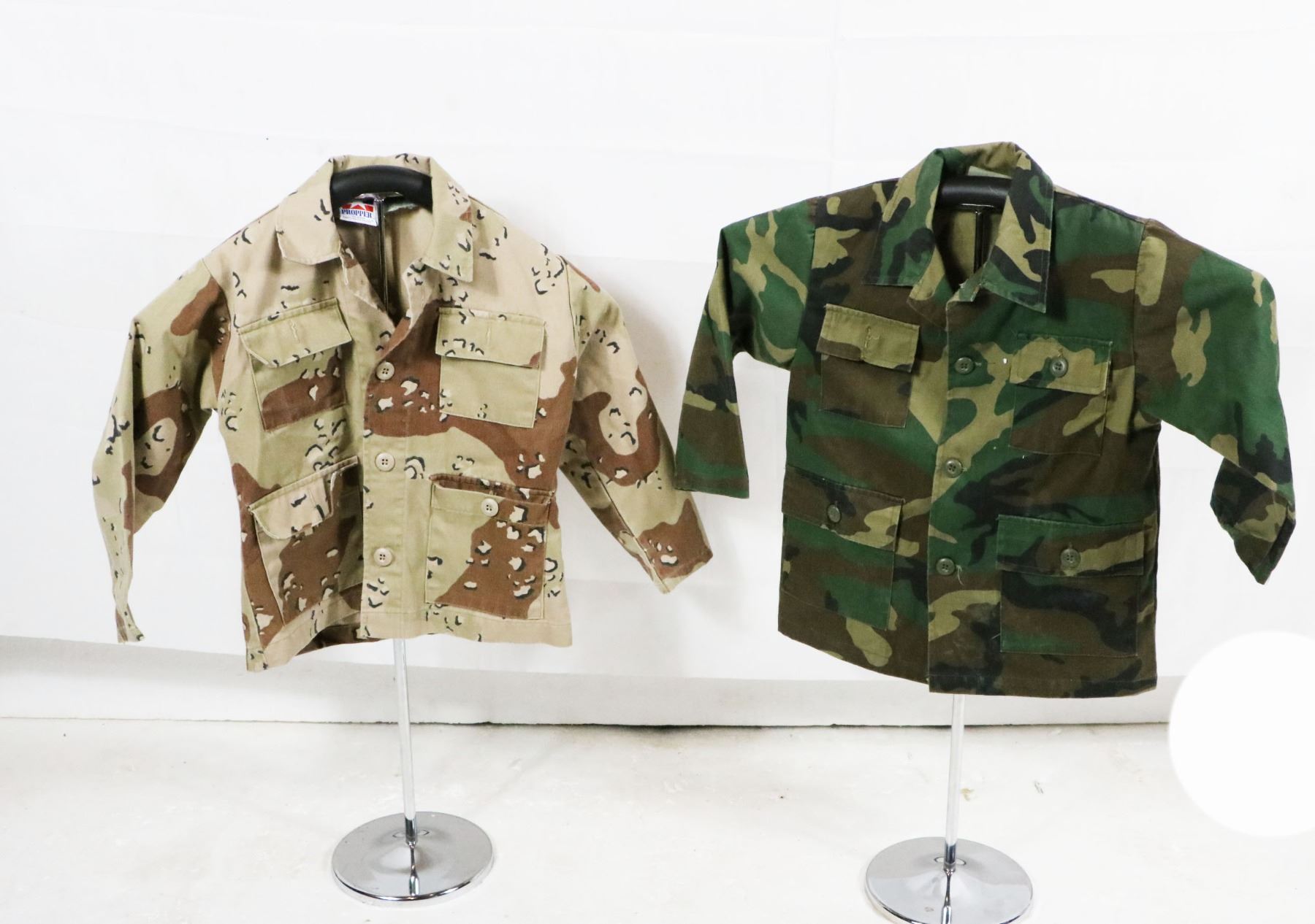 Lot of US military clothing and other items. Includes 2 coveralls, 1 desert night parka, small coat, and 3 children's T-shirts for clothing with straps, machine gun links, and two original US boxes for a M7A3 grenade launcher and ration heating. Ration box has heating items wrapped while the grenade launcher box is empty. All appear to be used. Sizes and condition vary.