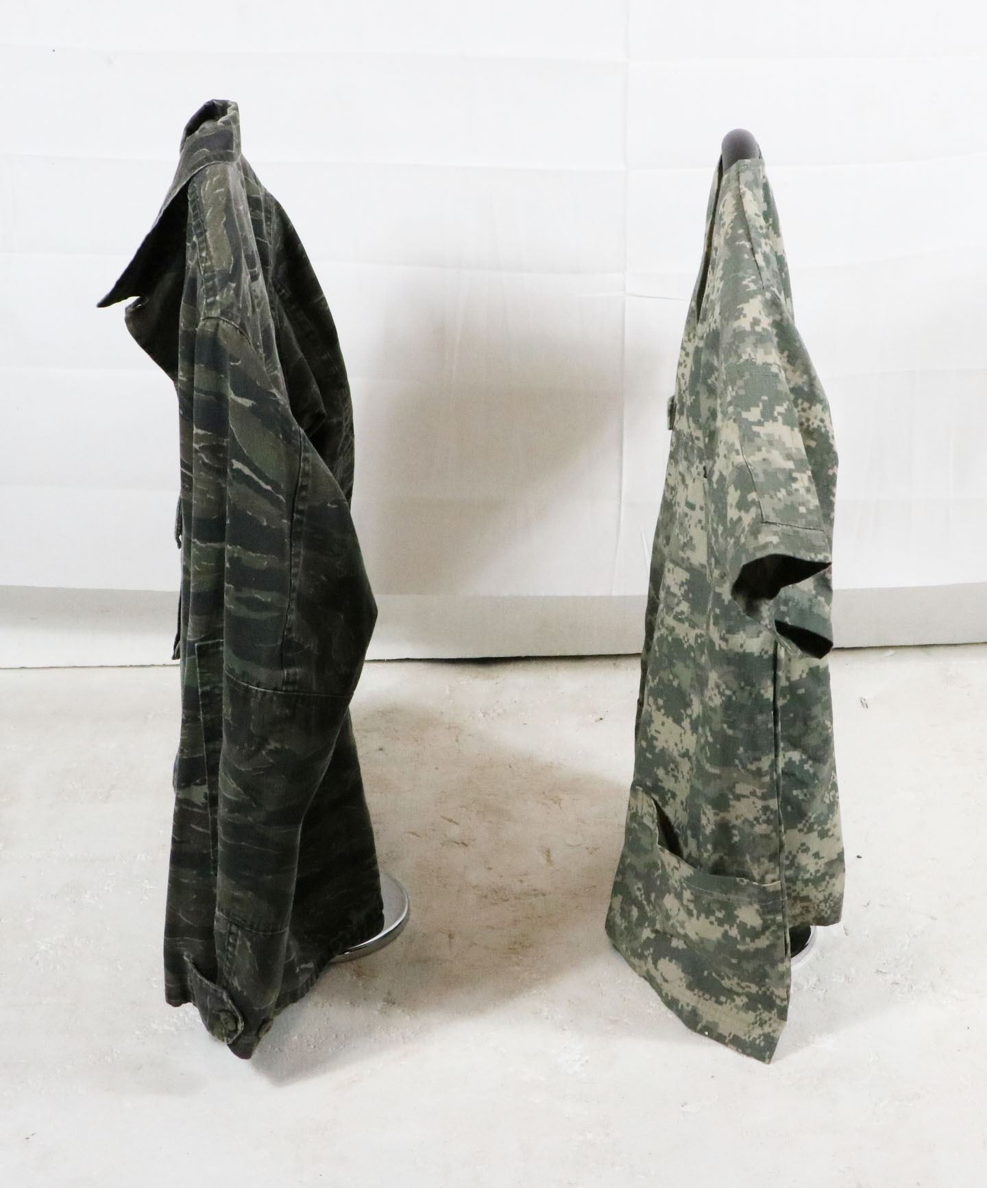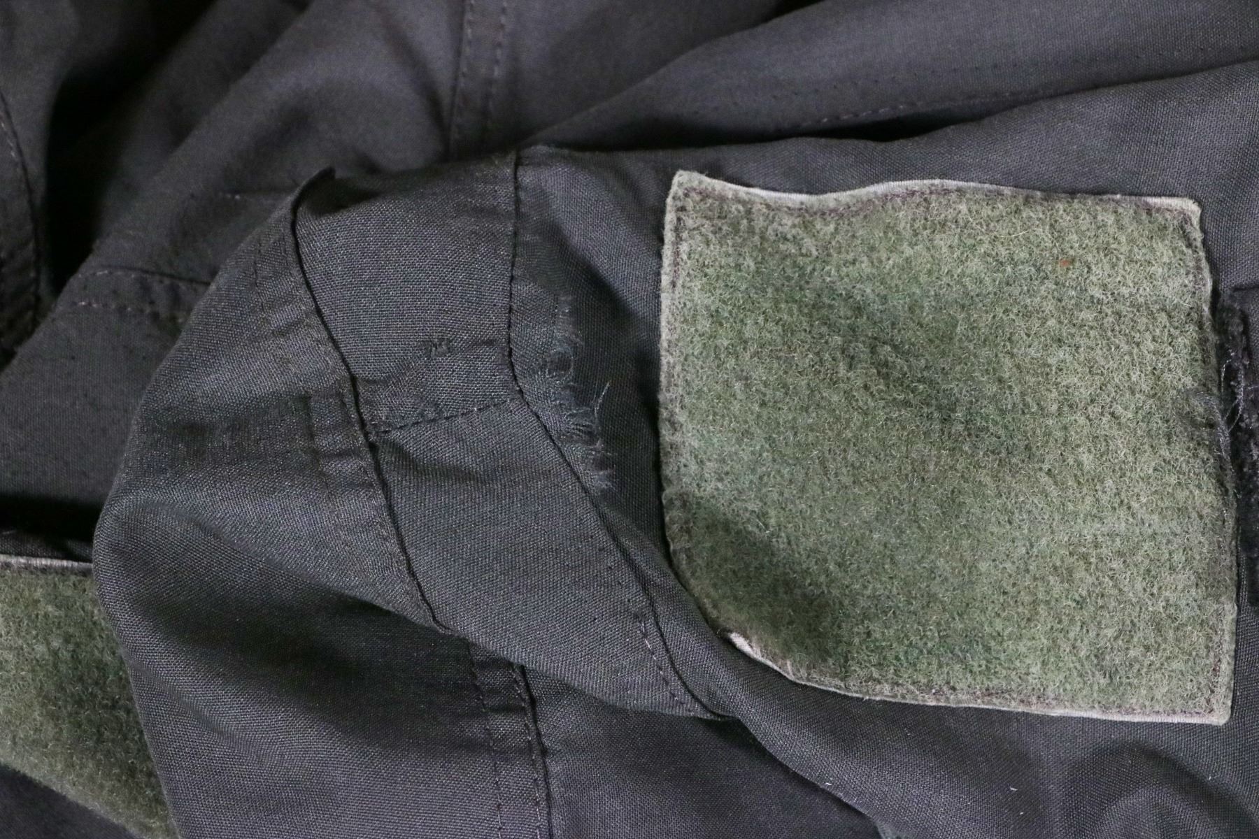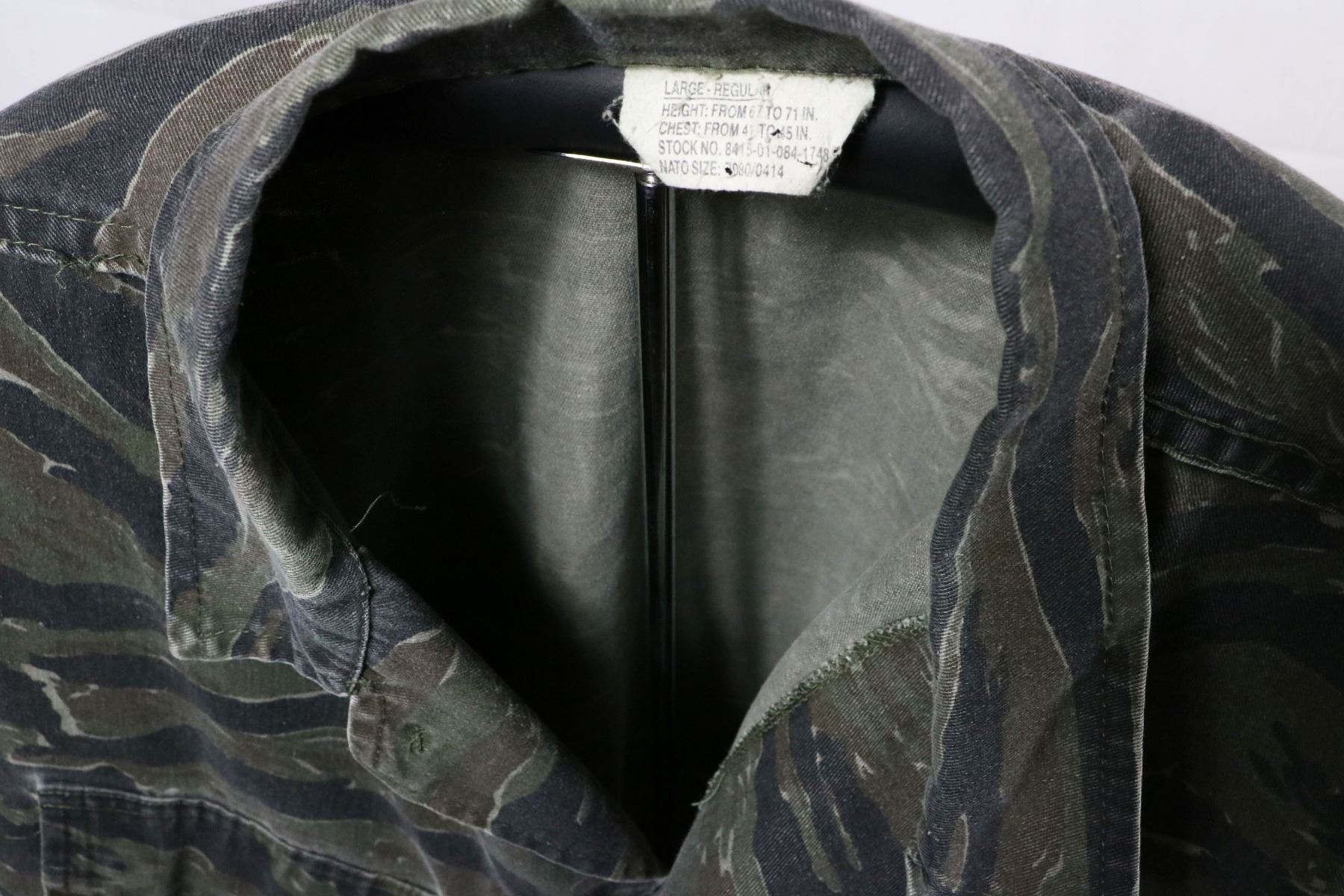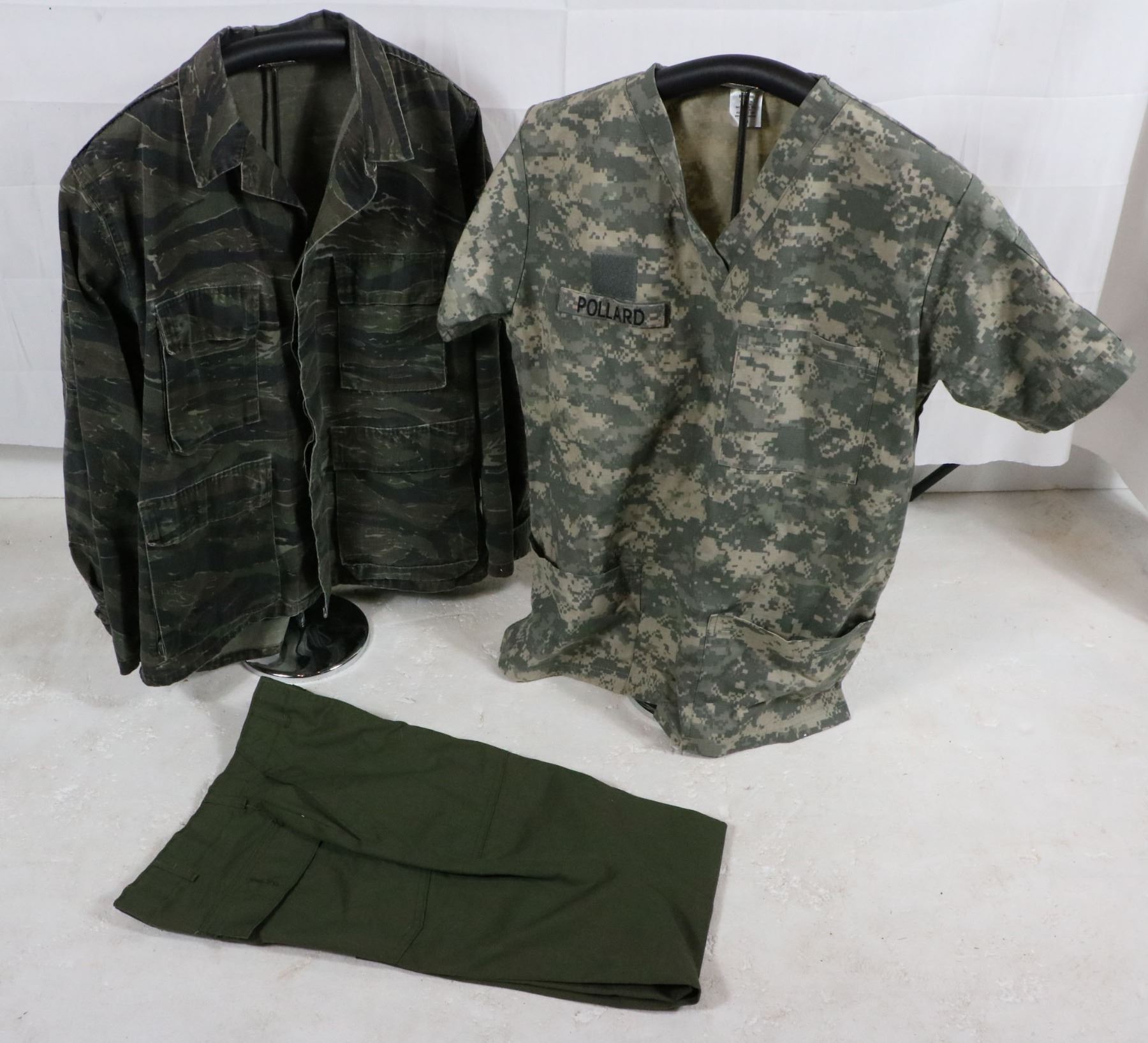 Lot of US military clothing and other items. Includes 2 coveralls, 1 desert night parka, small coat, and 3 children's T-shirts for clothing with straps, machine gun links, and two original US boxes for a M7A3 grenade launcher and ration heating. Ration box has heating items wrapped while the grenade launcher box is empty. All appear to be used. Sizes and condition vary.