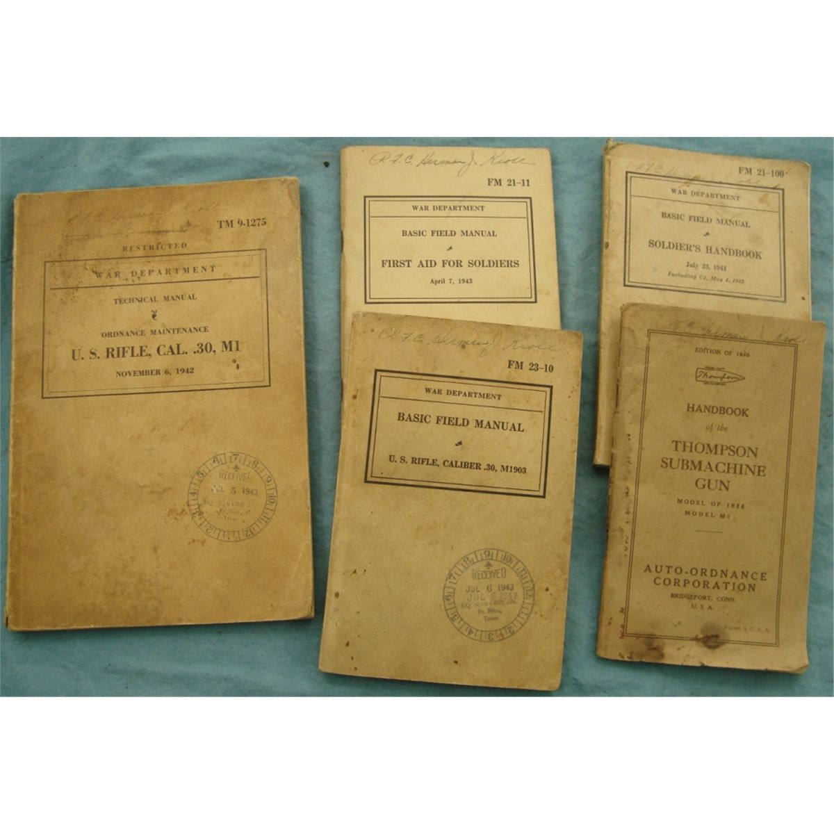 US Rifle 1903; Soldiers Handbook; US Rifle 30M1; First Aid for Soldiers; & Auto Ordinance Thompson Sub-Machine Gun Model 1928 Manual.