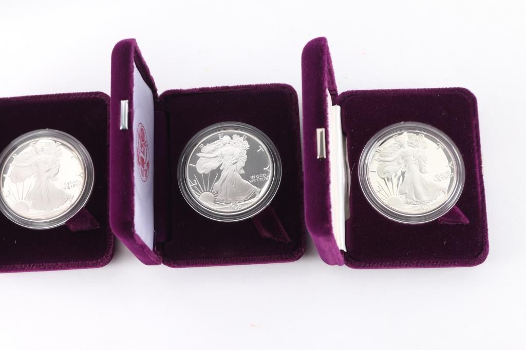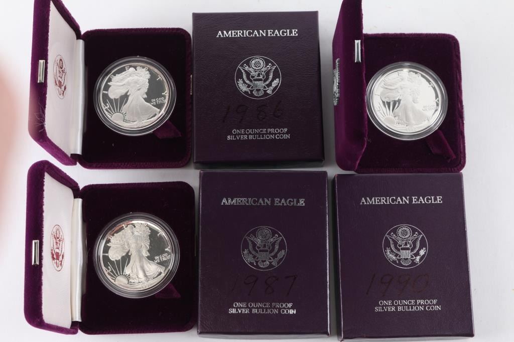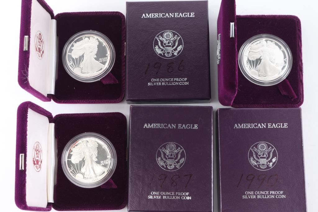 Three total. 1986, 1987 & 1990. All $1 American silver eagles, 1 oz. silver in Purple OGP w/spec sheets & COA, "Proof" condition & Mint mark "S".