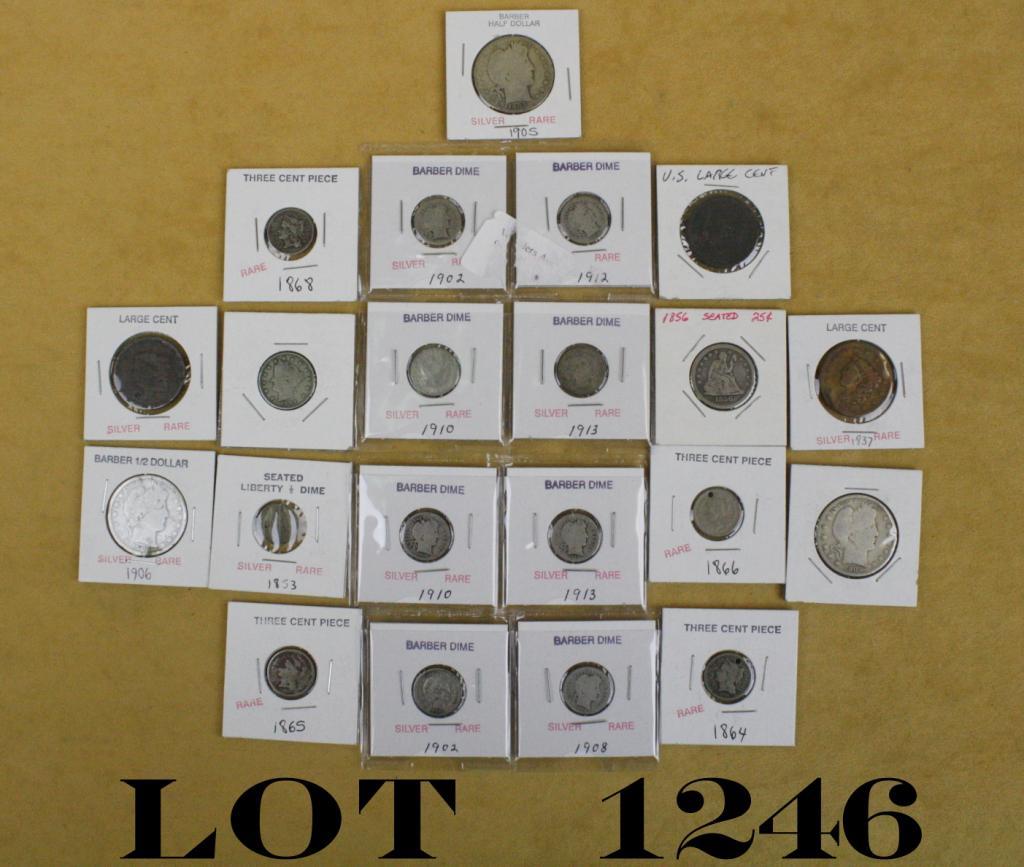 Lot of US collector’s coins including large Cent, 1856 seated liberty $0.25 piece, various 1850’s to early 1900’s US coins, not graded. Mostly circulated. Est: $100 - $200