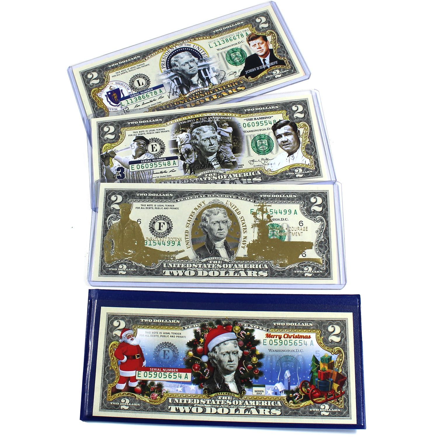 Lot of USA Legal Tender $2 Coloured or Gilded Commemorative Banknotes. You will receive notes commemorating the US Navy, John F. Kennedy, "The Bambino" & Merry Christmas. All notes come in hard plastic holders. 4pcs