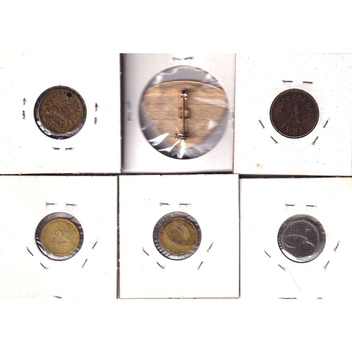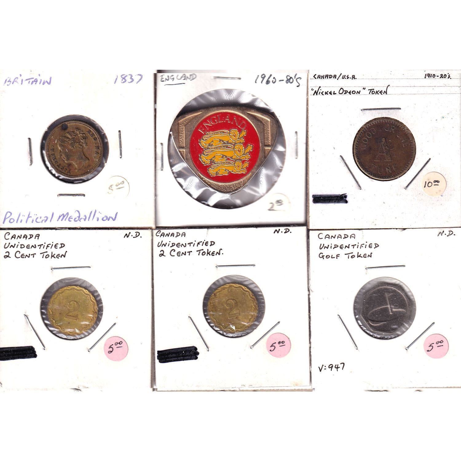 Lot of Unidentified Tokens - 1837 Great Britain 'To Hanover' Victoria, 1960-1980's England Enameled Pin, 'Good For A Tune', 2x 2-cent Tokens & a Golf Token. 6pcs