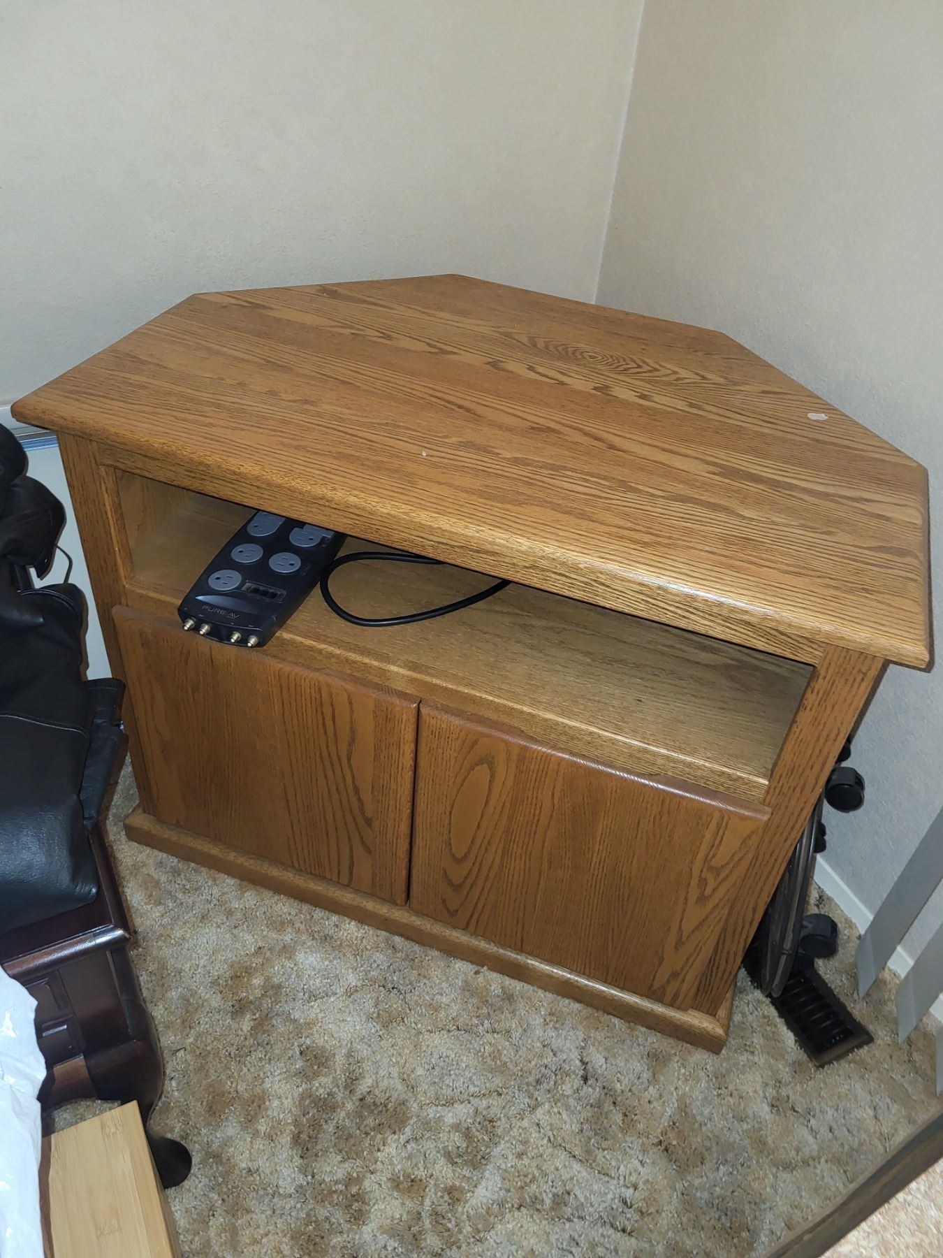 18 Wooden(?) Corner Tv Entertainment Stand With Multi Outlet Power Bar