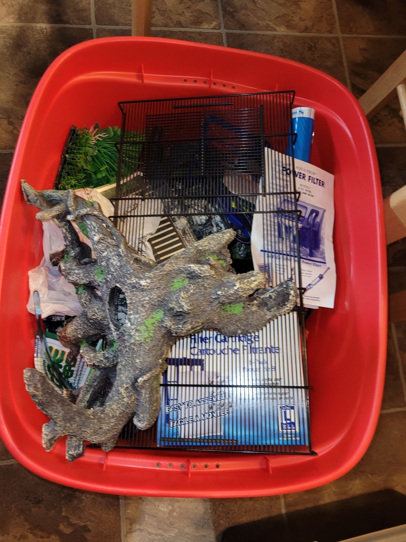 229 Large Red Tote with Fish Supplies - Filter, Accessories +++ - Lots in this one!