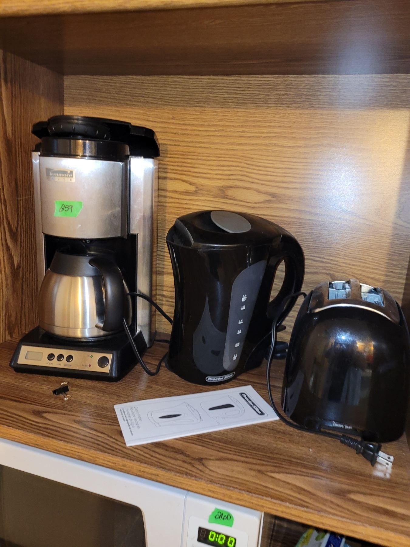 259 Kenmore Elite Coffee Maker, Proctor Silex Kettle (near new) and Toaster