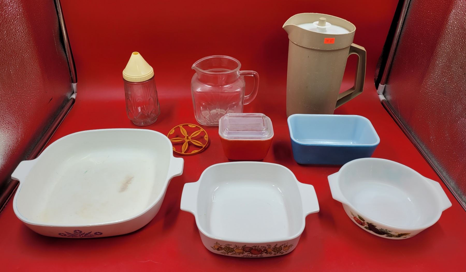 Lot of VTG Kitchenware w/ Plastic Pitcher, Pyrex Refrigerator Dish, Corning Ware, & More