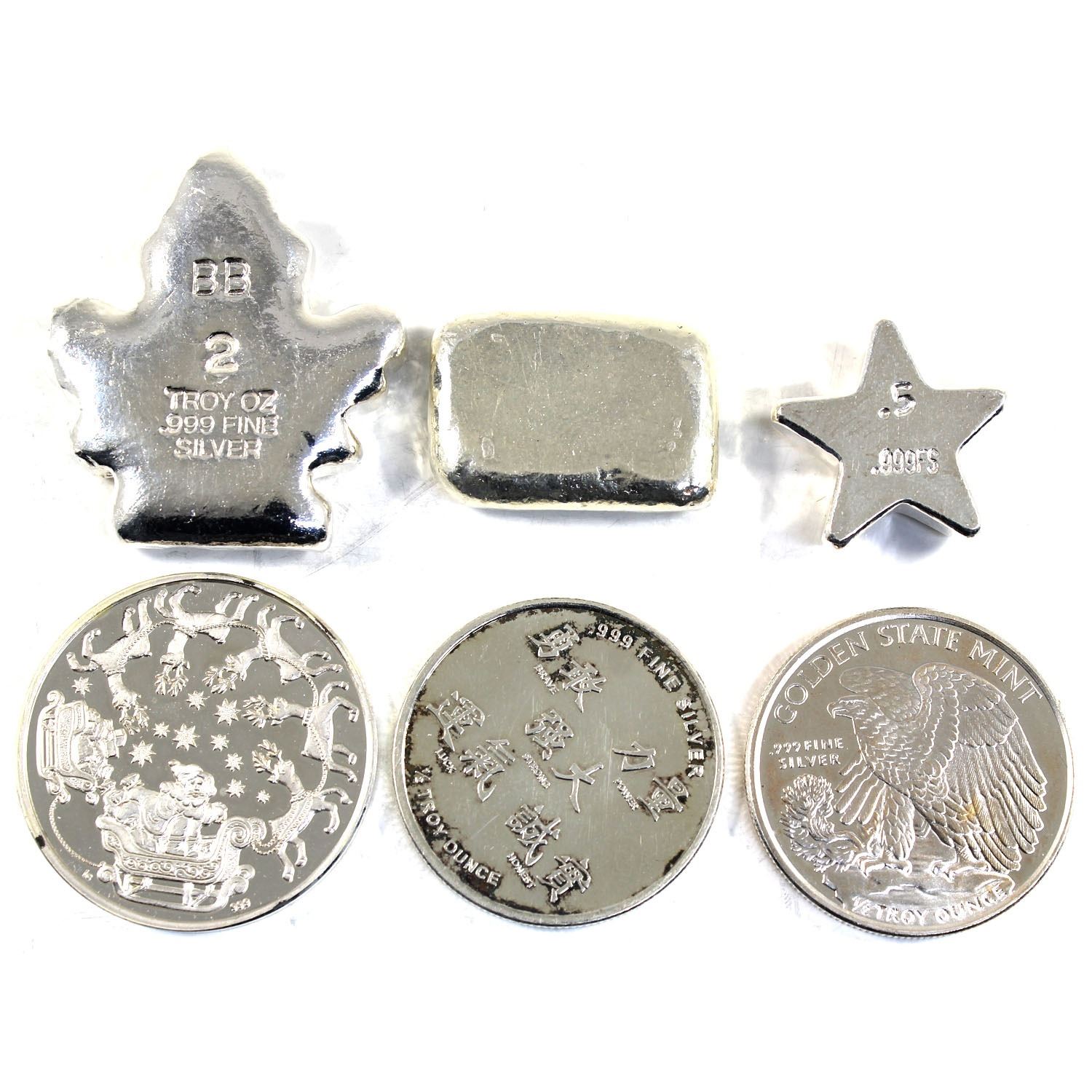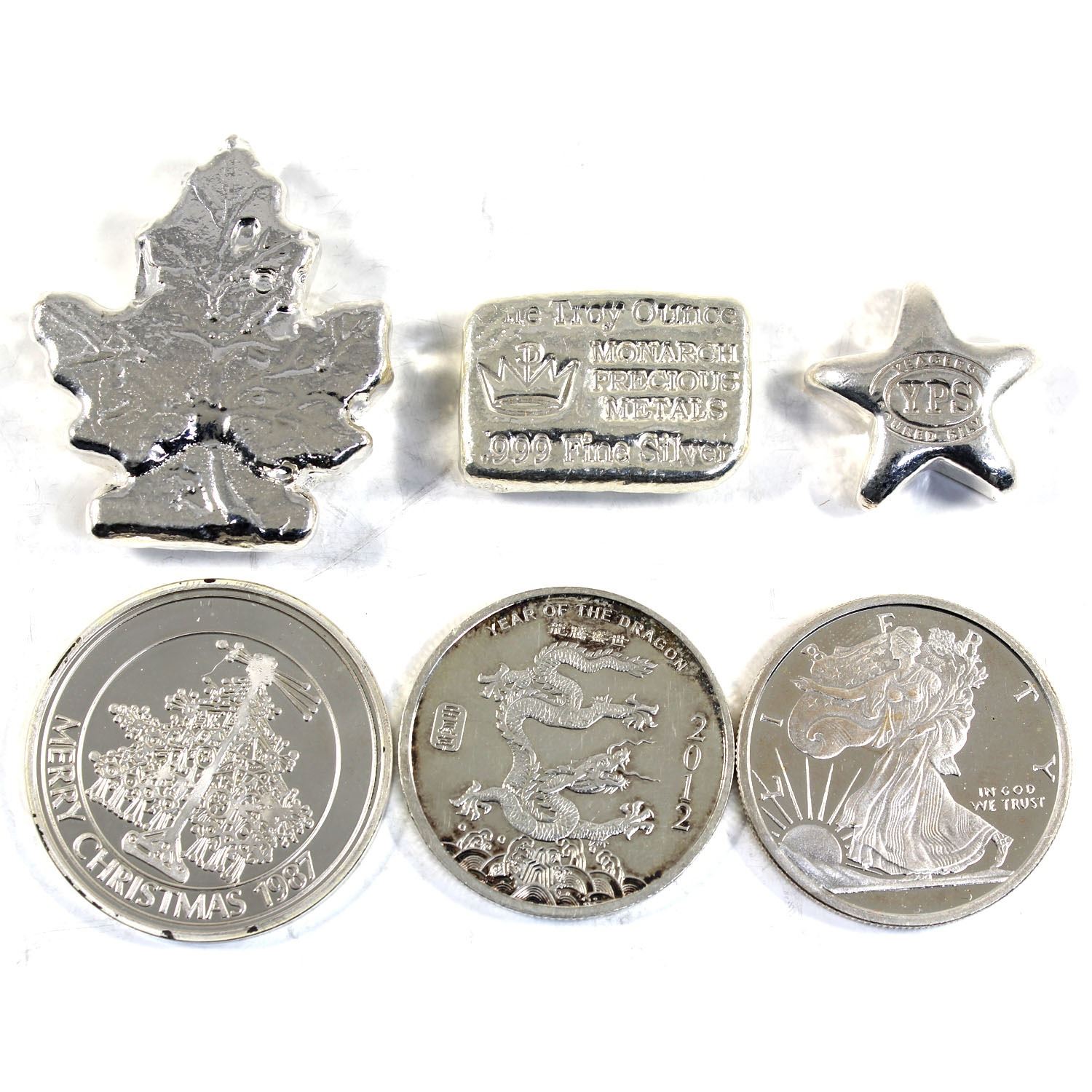 Lot of Various Sized .999 Fine Silver Pieces - 1/2oz Year of the Dragon, 1/2oz Golden State Mint, 1/2oz 1987 Merry Christmas, 1/2oz Yeager's Poured Silver Star, 1oz Monarch Precious Metals Poured Bar & 2oz Beaver Bullion Maple Leaf. 6pcs (TAX Exempt)