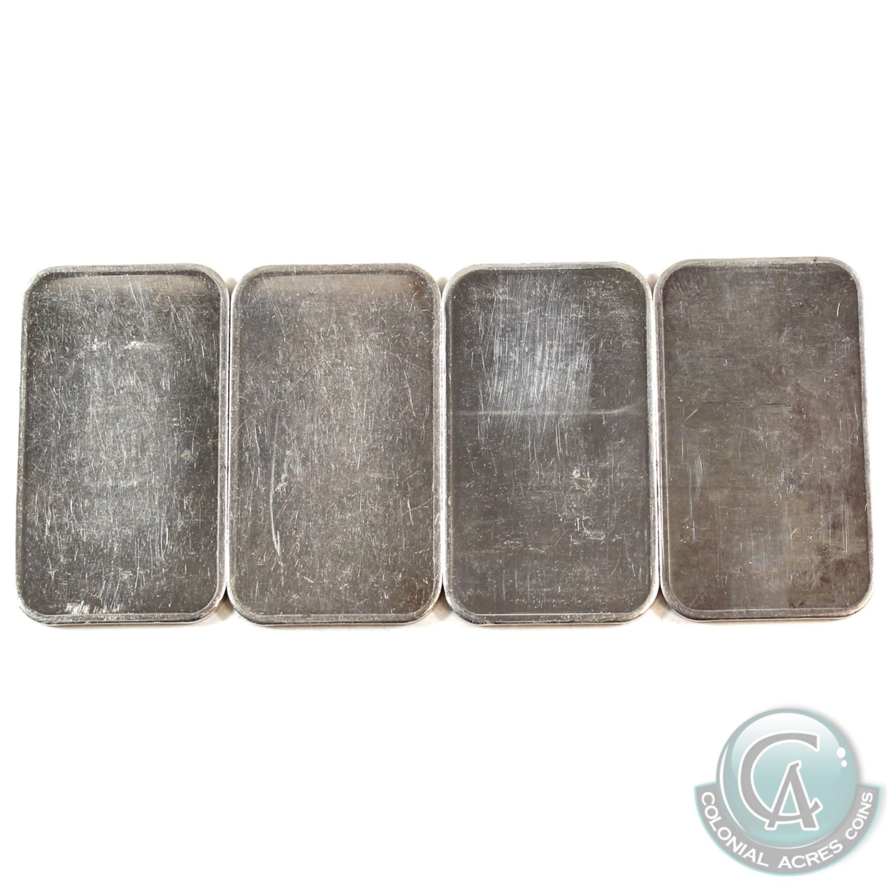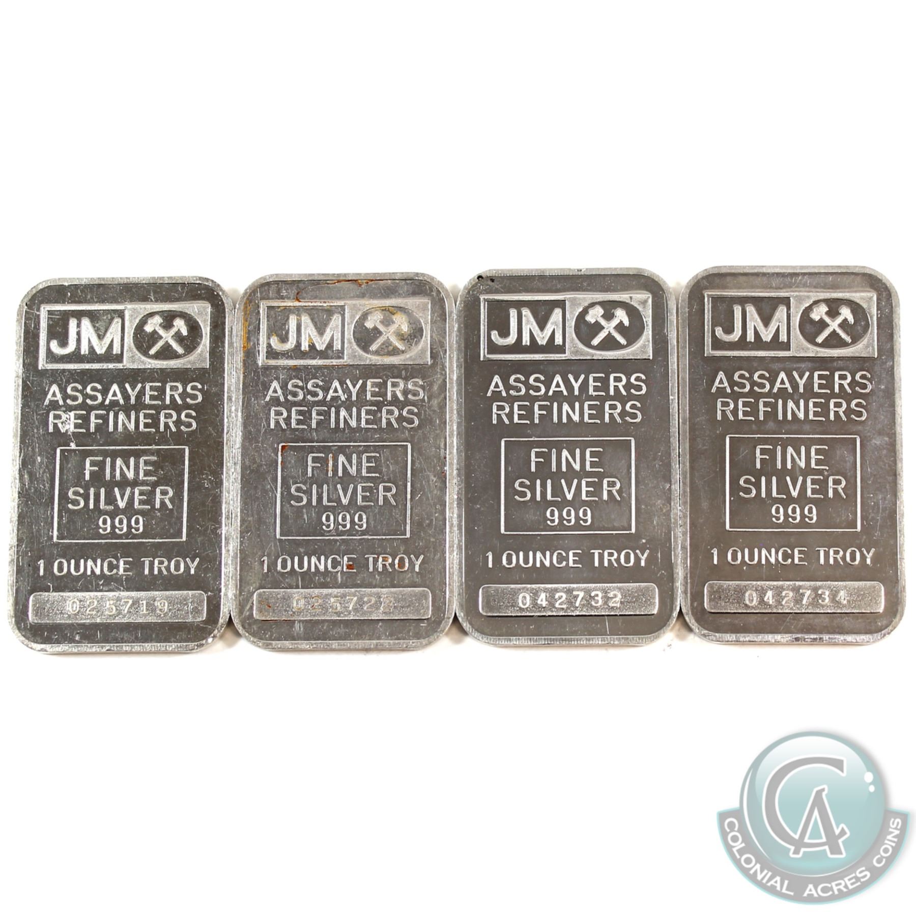 Lot of Vintage 1979 Johnson Matthey 1oz Fine Silver Bars with Blank Back (TAX Exempt). First produced in 1979 by Johnson Matthey with 'Fine' and 'Silver' on two seperate lines. Serial # 042732, 042734, 025722, 025719. 4pcs.