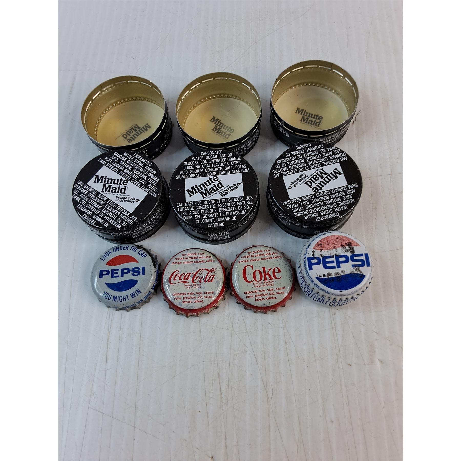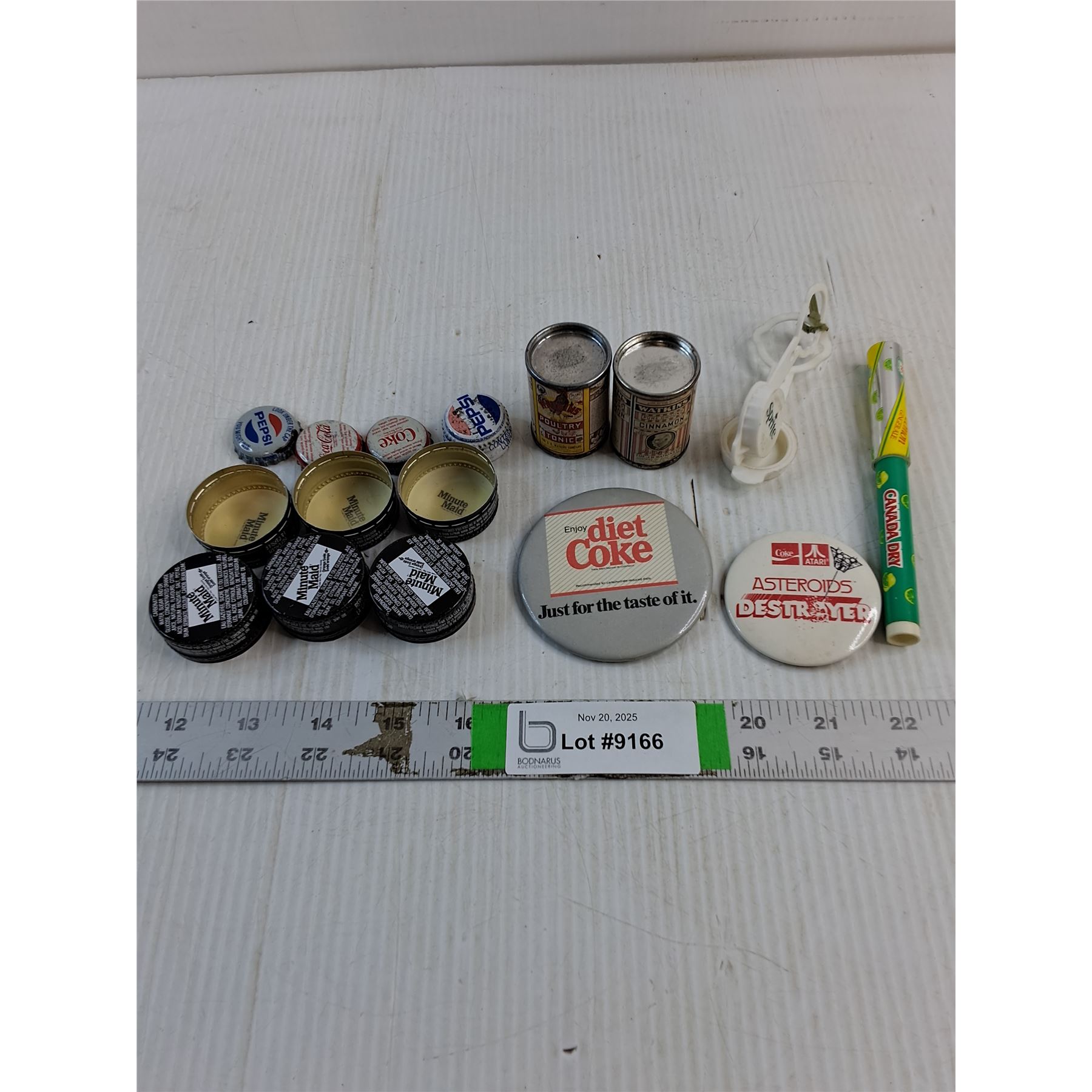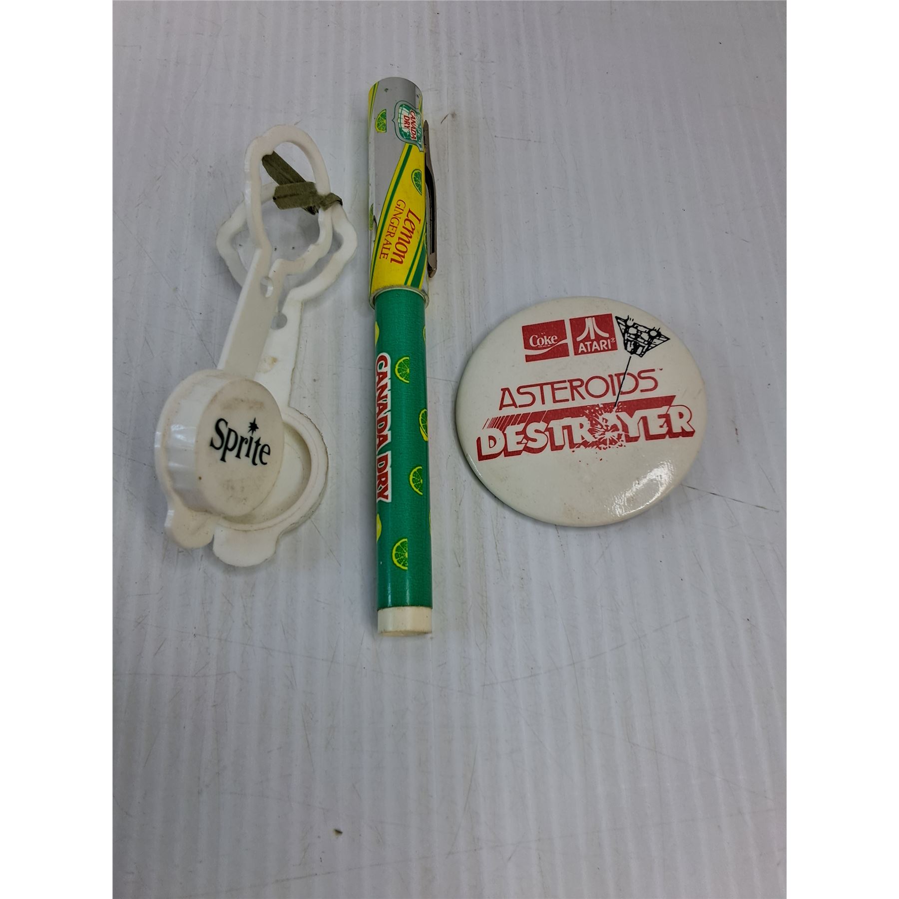 Lot of Vintage Bottle Caps,(2) Badges,(2) Fridge Magnets,(2) Sprite Cap Snap Seal,Canada Dry Pen