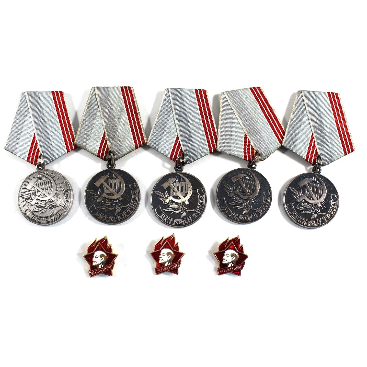 Lot of Vintage CCCP Russia Soviet 3A Betepah Tpya Medals with Enameled Lenin Pins. You will receive 5x medals and 3x pins. 8pcs