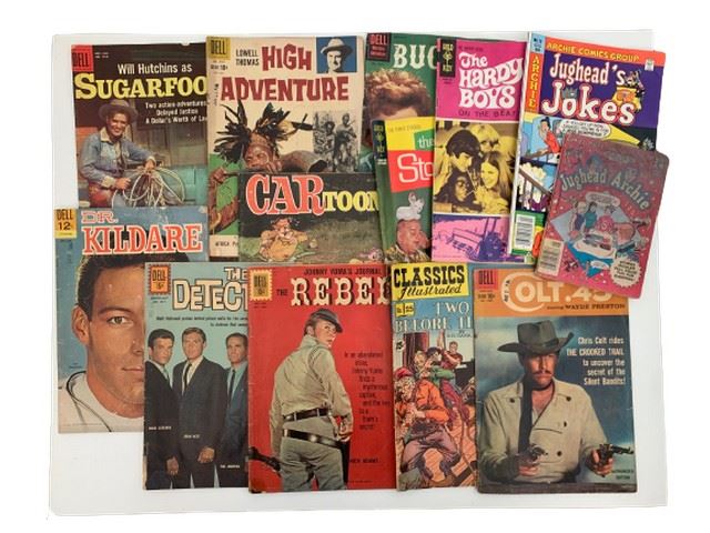 Jugheads Jokes #72, April, 1981. Jughead with Archie book # 18, January, 1977. The Hardy Boys #4, January, 1971. The Three Stooges #52, September, 1971 (major crease on the left side). Lowell Thomas High Adventure #1001 August to October 1959. Cartoons magazine from August 1970 issue #54. Classics Illustrated #25 from October 1945. Colt .45 starring Wayde Preston, issue #1004, June to August, 1959. The Rebel #1262, December to February, 1962. Buckskin #1107, June to August 1960 (large crease down the middle). Dr. Kildare issue #9 April to June, 1965. Will Hutchins as Sugarfoot #1059, November to January, 1960 and The Detectives Issue #1219, March to May 1962. All comics/magazines are in worn condition.