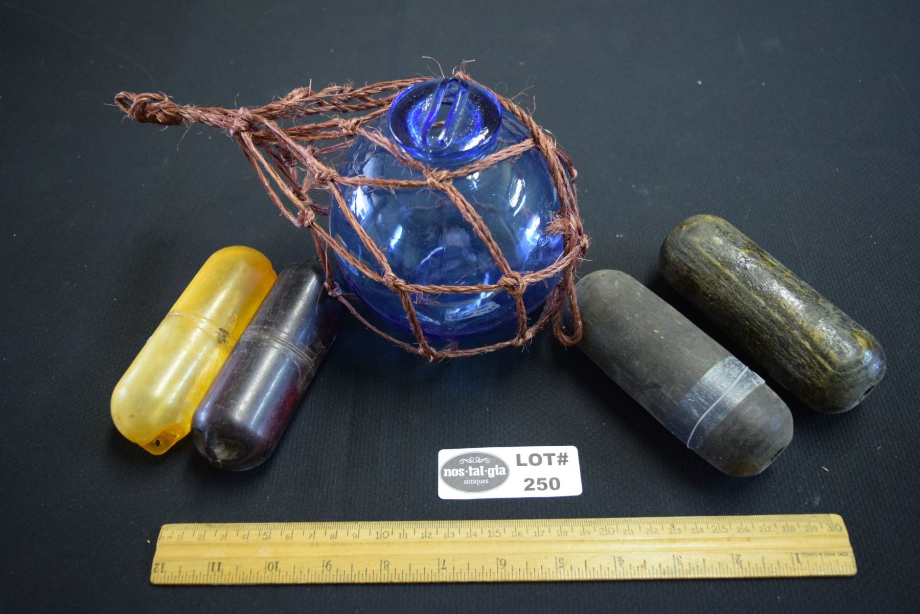 2 wood floats, 2 plastic floats and Hanging Blue glass Float Bank in Netting