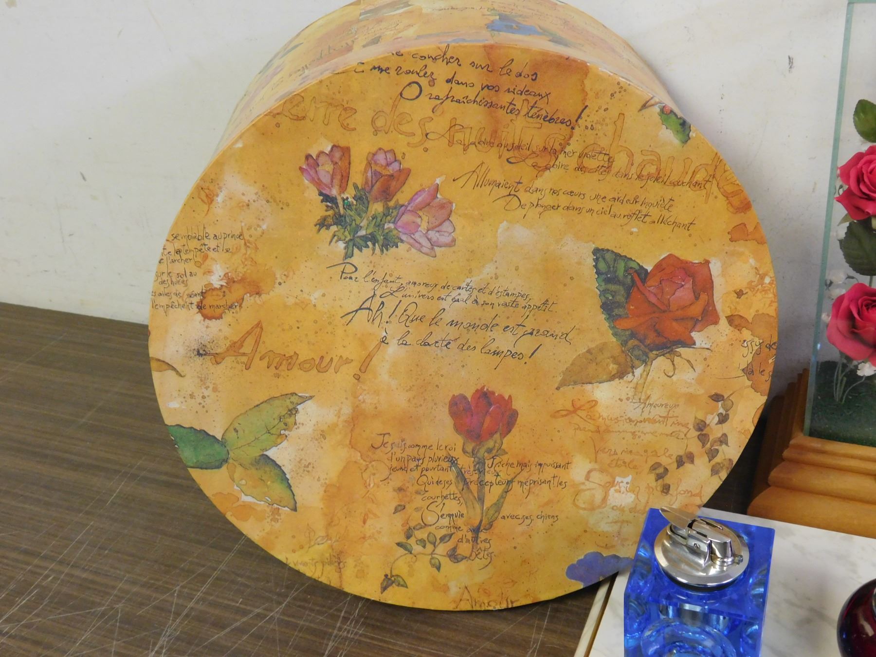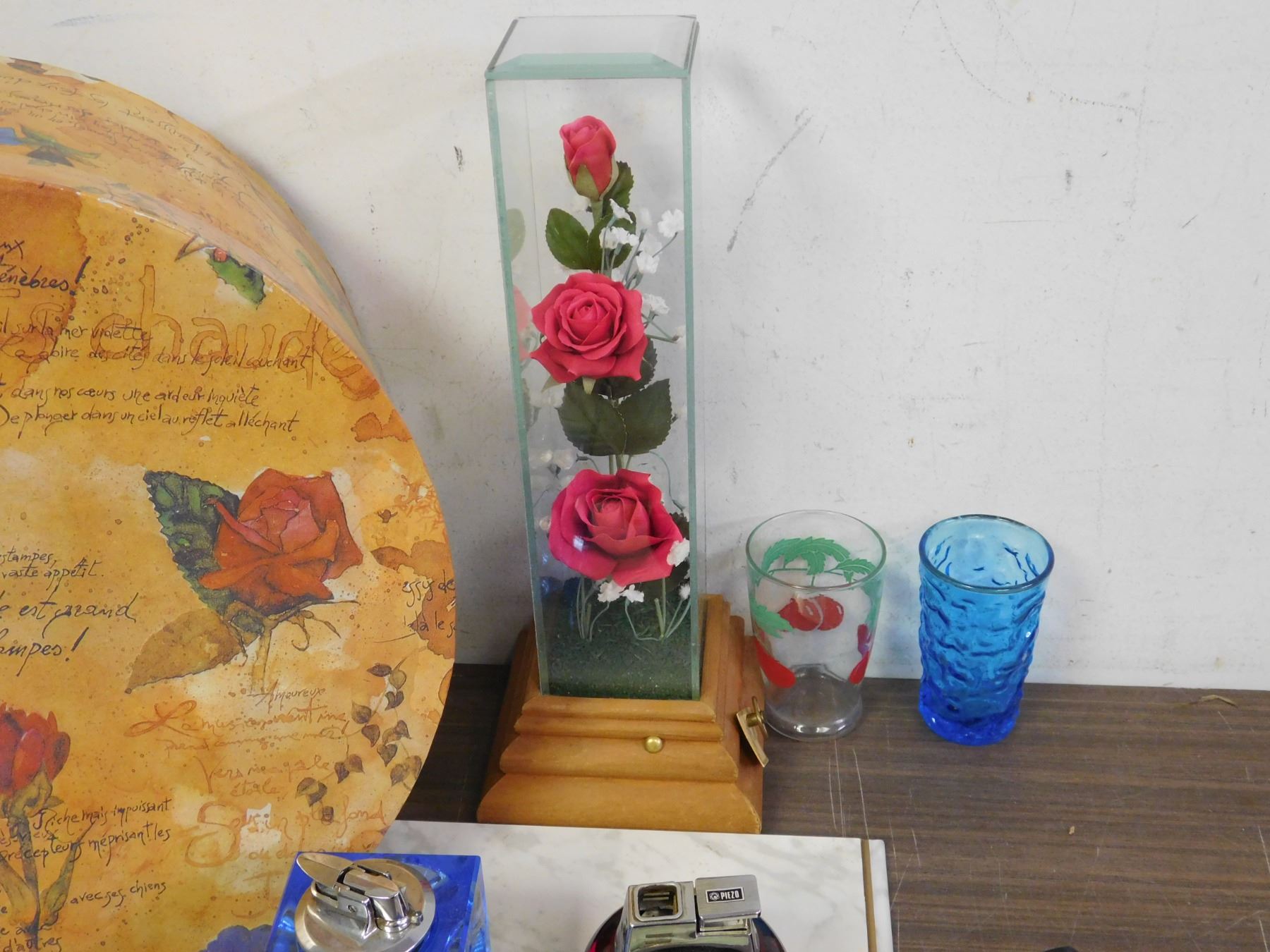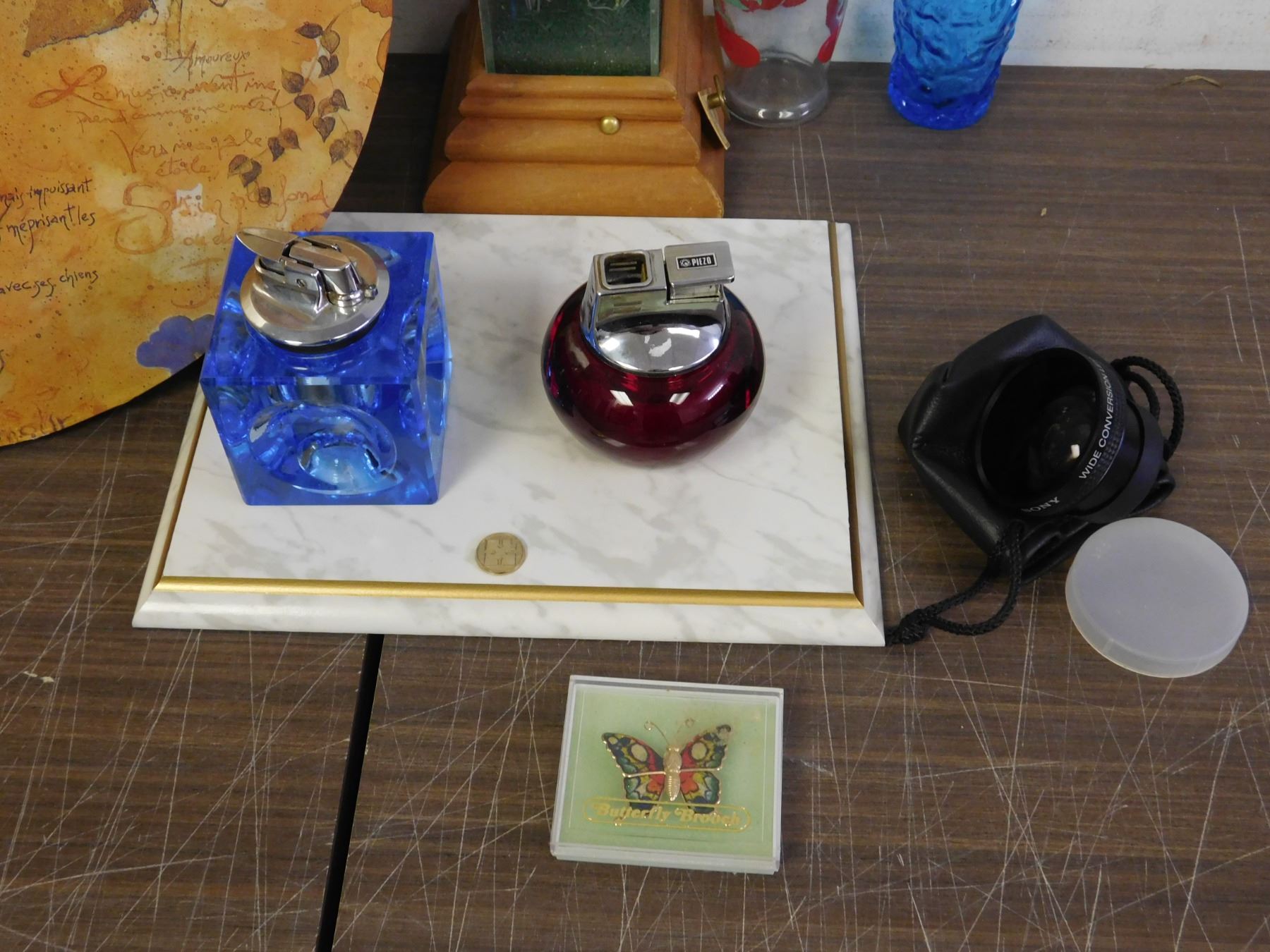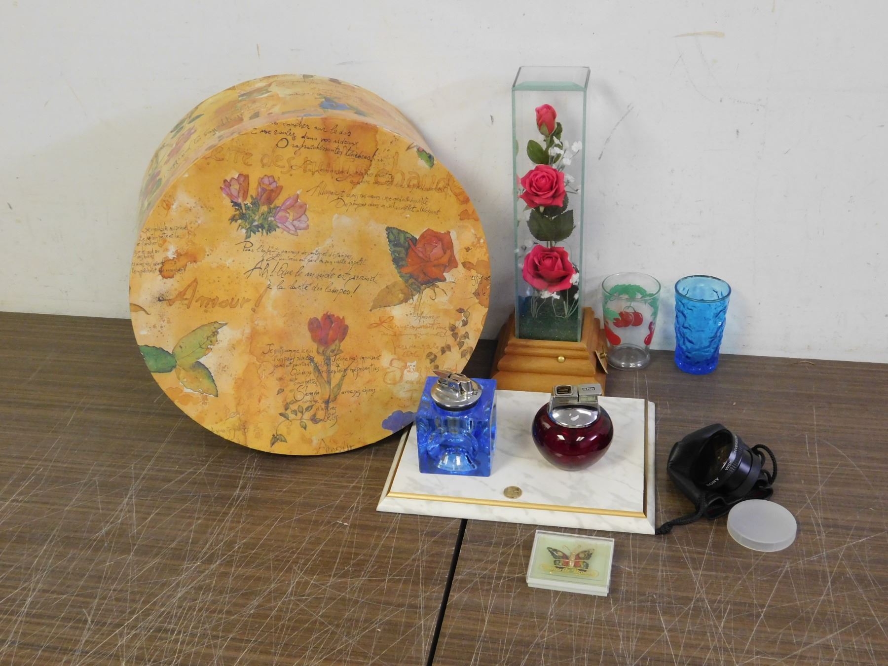 Lot of Vintage Household Table Lighters, Juice Glasses, Marble Desktop Slab, Camera Lens, Hat Box
