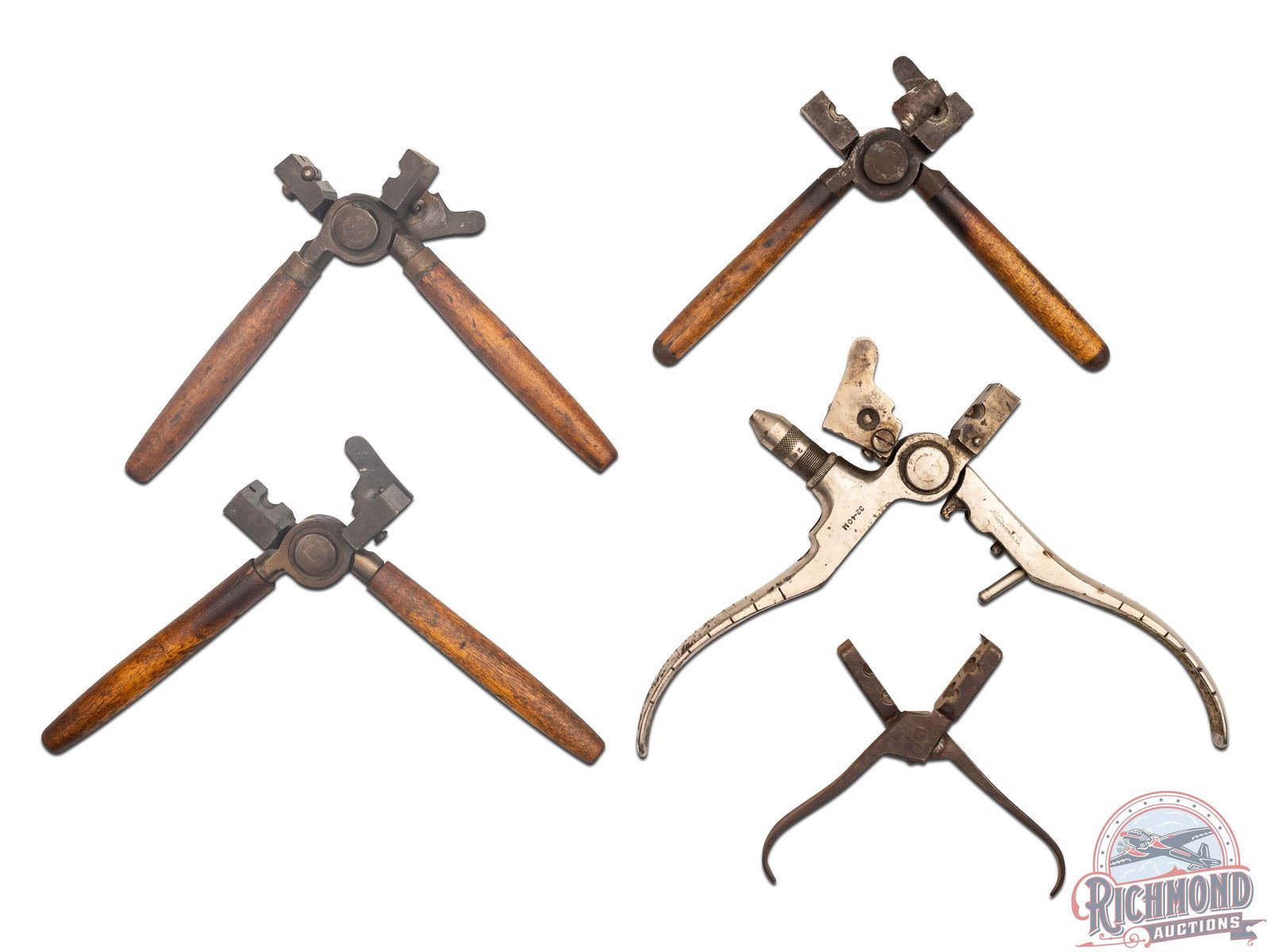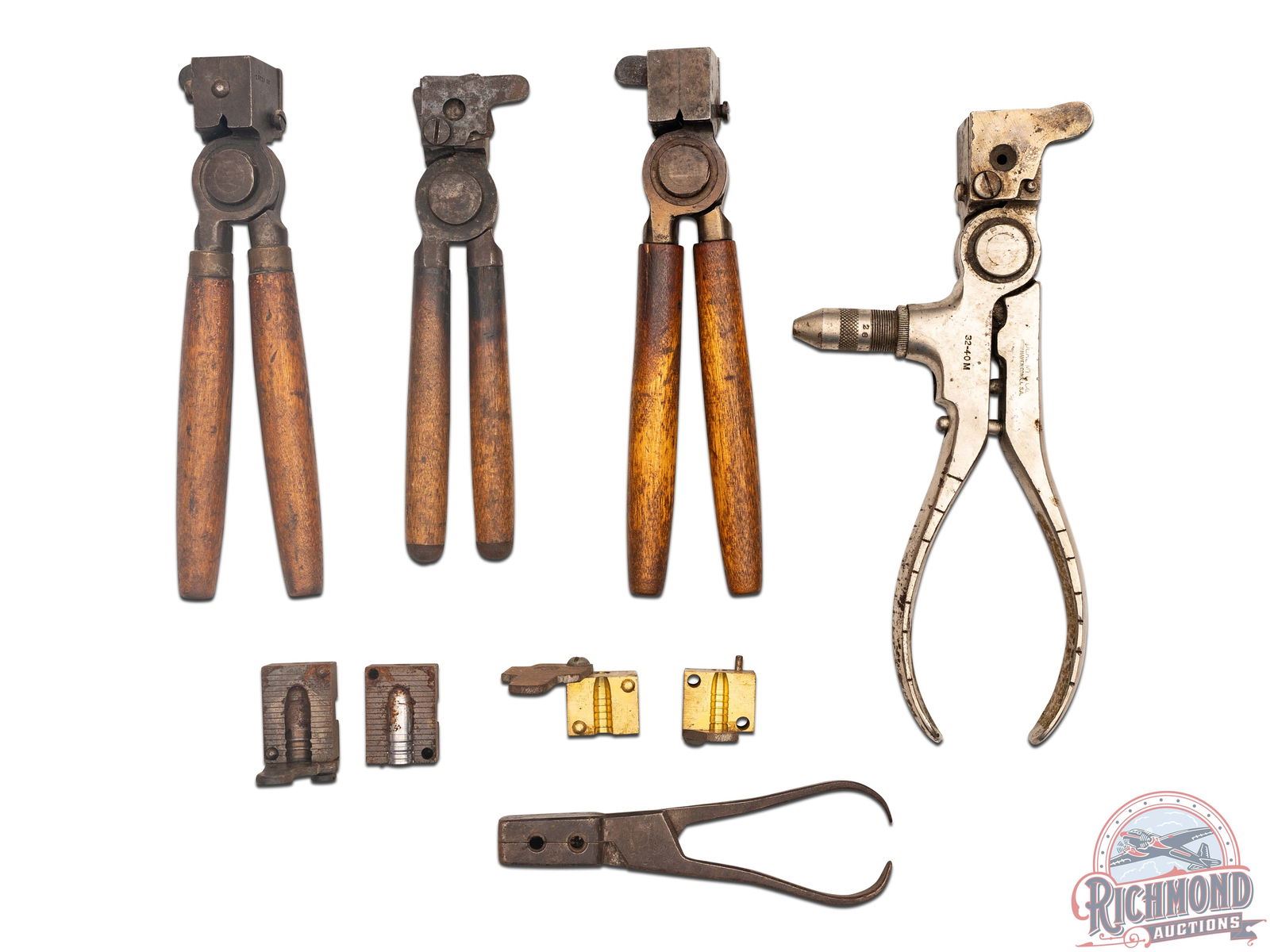 Lot consists of Lyman tong tool mold and wooden handle mold in 32-40 Marlin Caliber, one M.F.A. Co. mold marked "32-185", one Ideal 25 caliber mold, a brass 25 caliber two piece mold, Lyman 38 caliber mold and a Kentucky style two cavity 38 caliber mold.