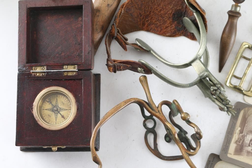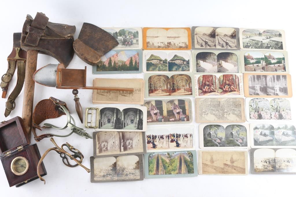 Spurs, compass, ax with cover, metal chopper, and antique "Stereo-Graphoscope" Viewer (metal and wood) with cards, hook and buckle. From the Estate of Joseph Musso. From the Estate of Joe Musso.