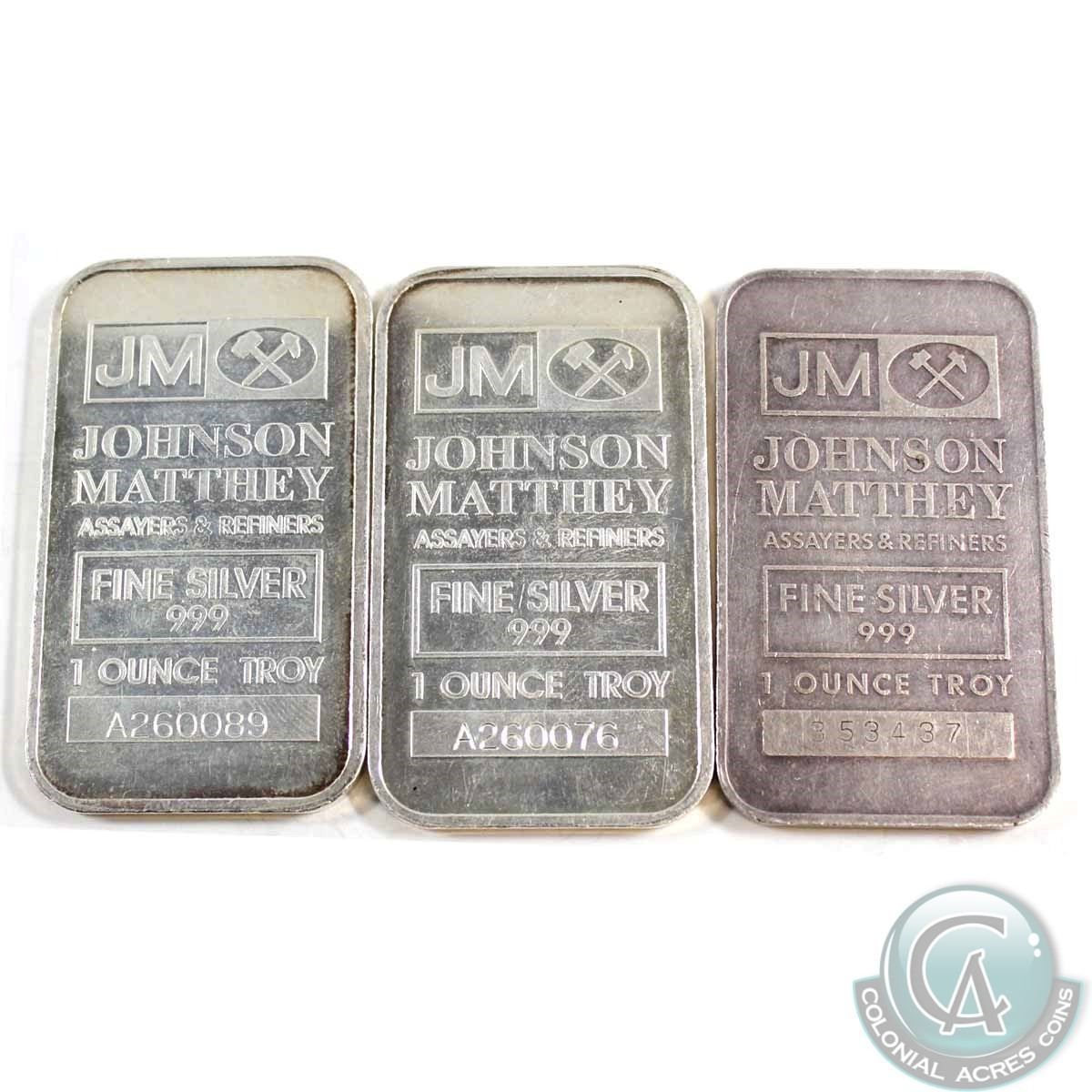 Lot of Vintage Johnson Matthey 1oz Fine Silver Bars 'JM Logo' (TAX Exempt). 3pcs