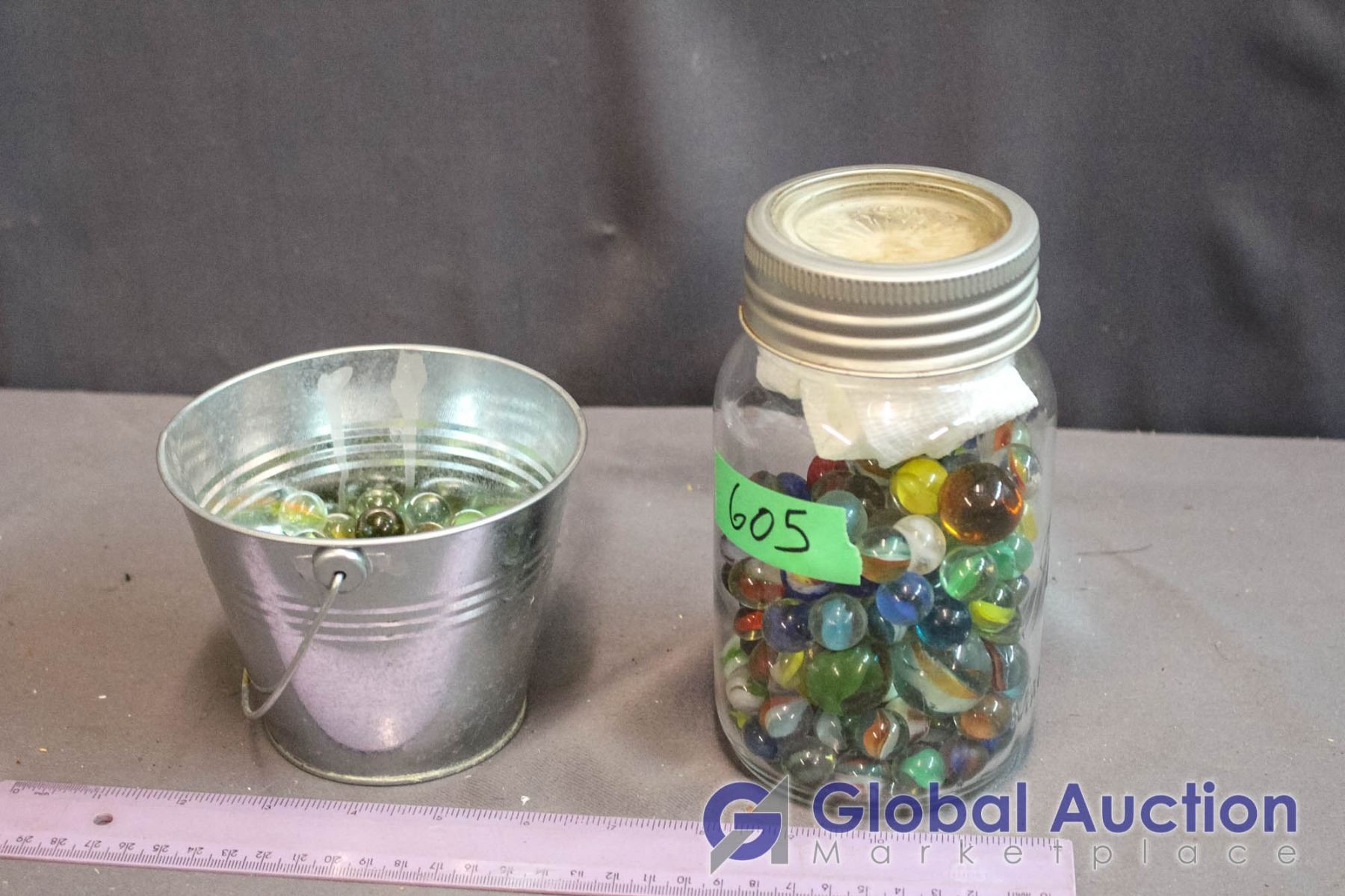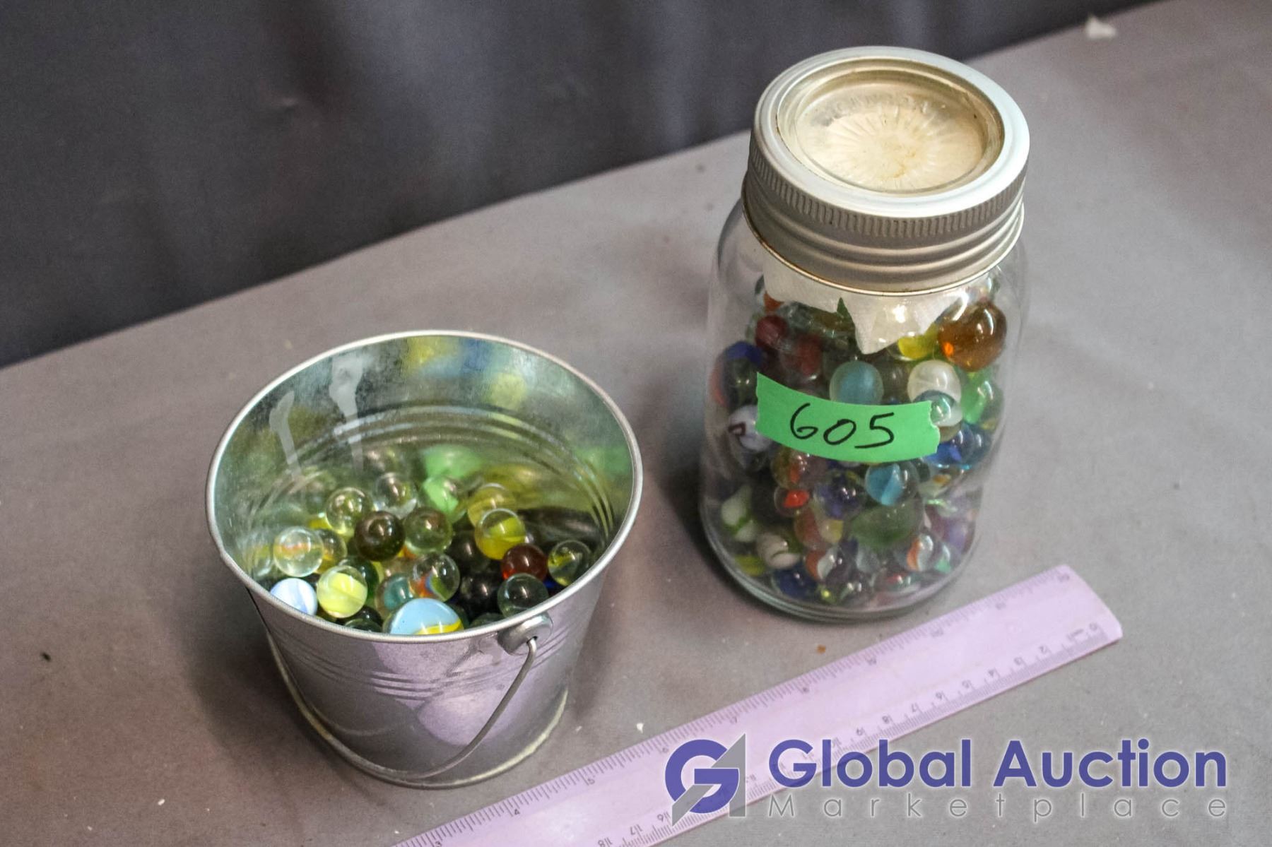 Lot of Vintage Marbles in Glass Jar & Small Metal Pail