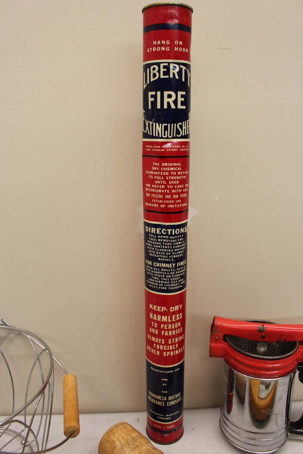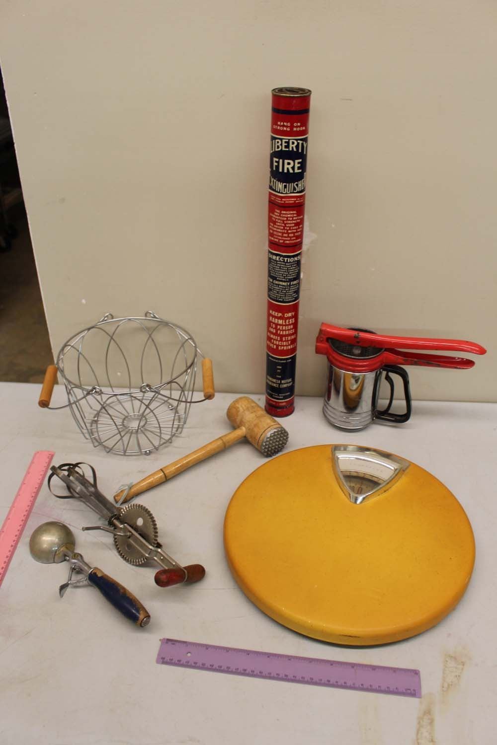 Lot of Vintage Misc: Liberty Fire Extinguisher Dry Chemical Tube, Kitchen Utensils, Etc