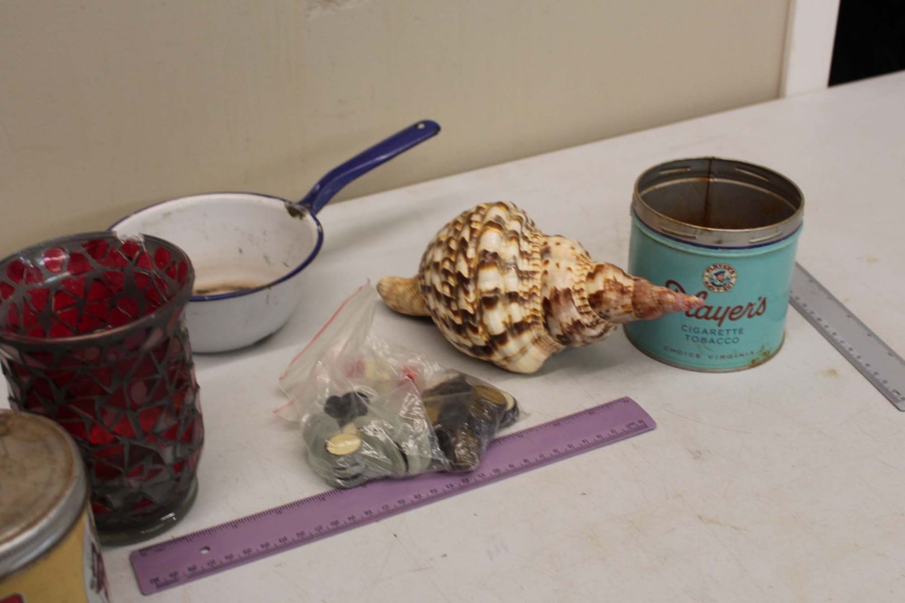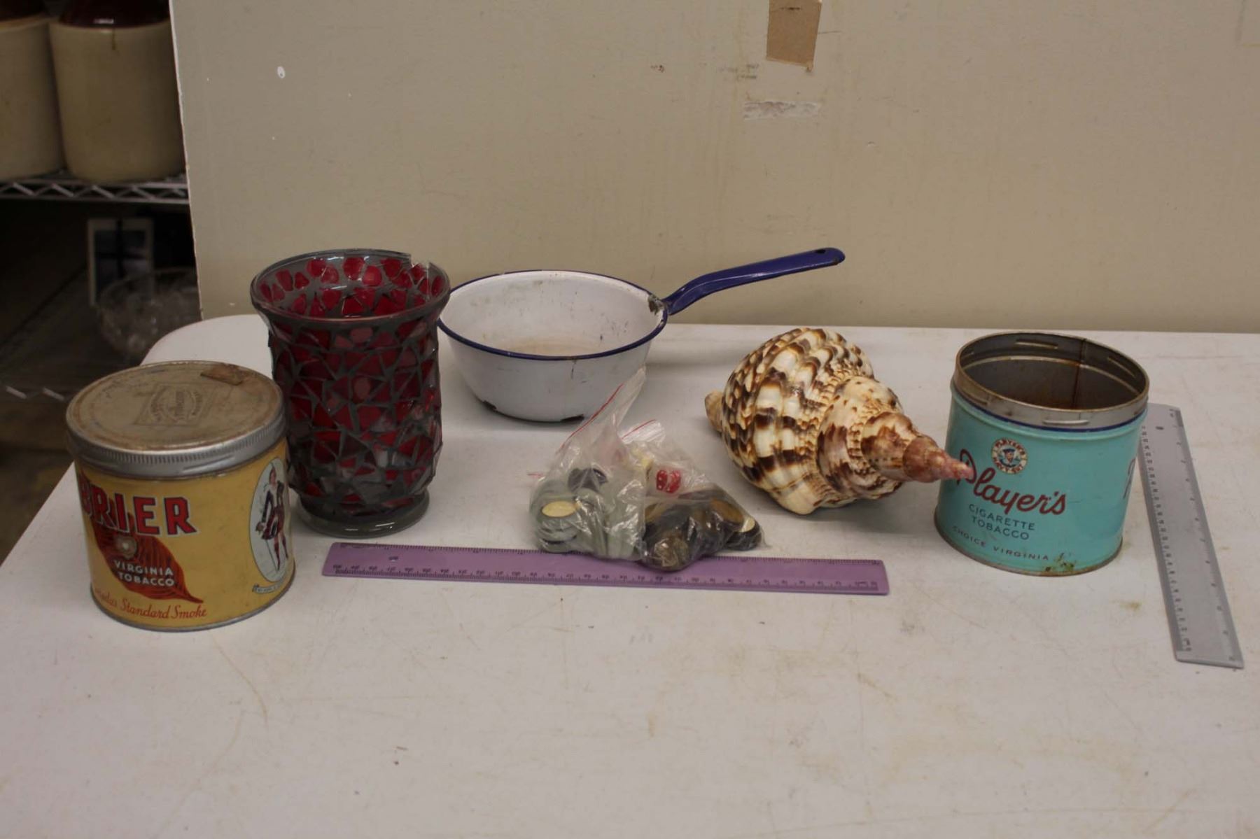 Lot of Vintage Misc - Tobacco Tins, Enamel Shell, Game Pieces, etc