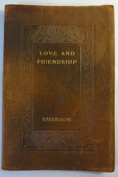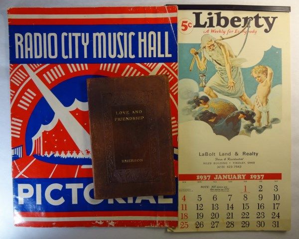 Ralph Waldo Emerson "Love and Friendship" with a leather cover, 6.5 x 4.5". The Calendar reprint lays LaBolt Land & Realty, Niles Building, Findlay, Ohio, Radio City Music Hall Pictorial from the 1950's?