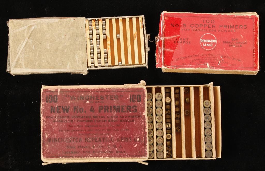 All are partial boxes. One is of small primers for pistol. One is for large shotshells. Last is for small shotshells(?).