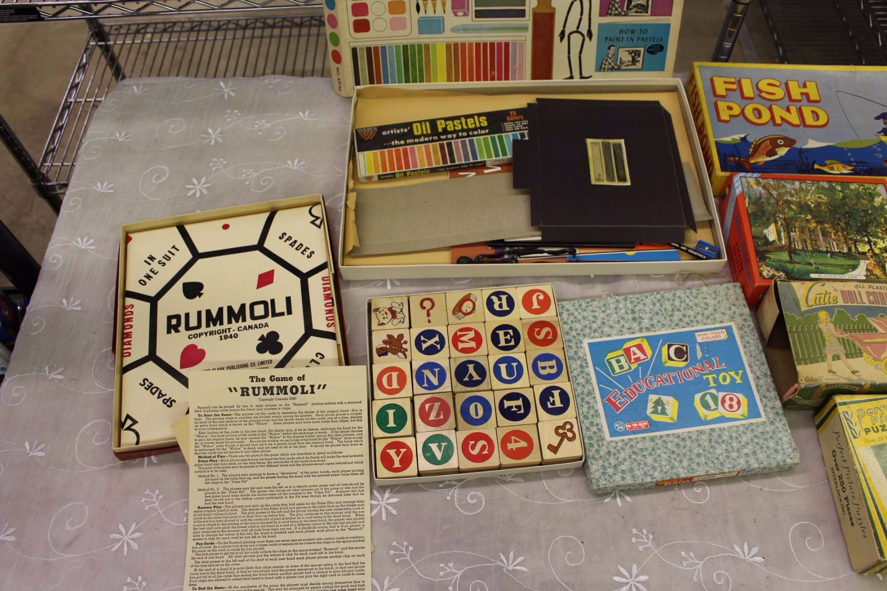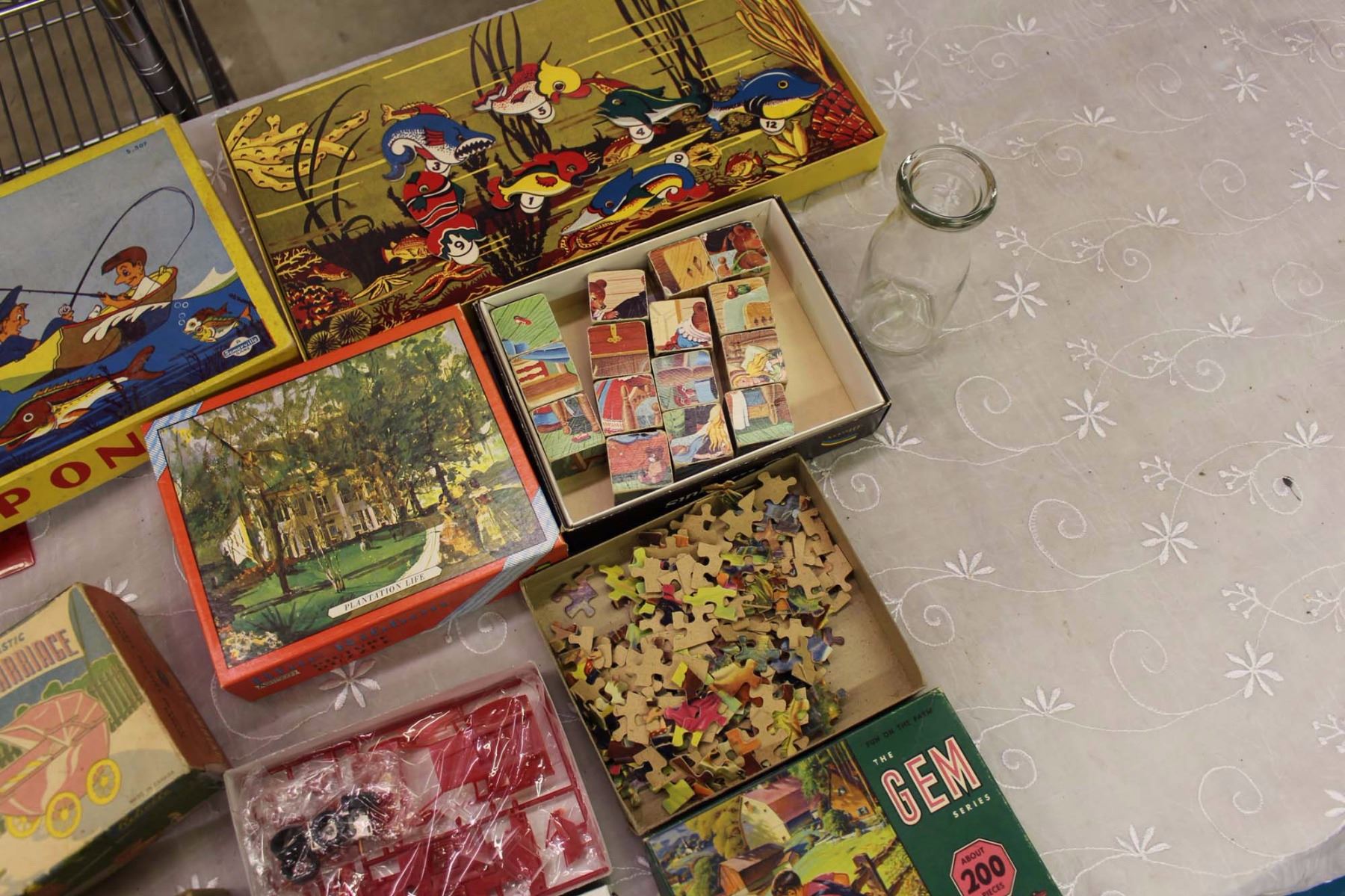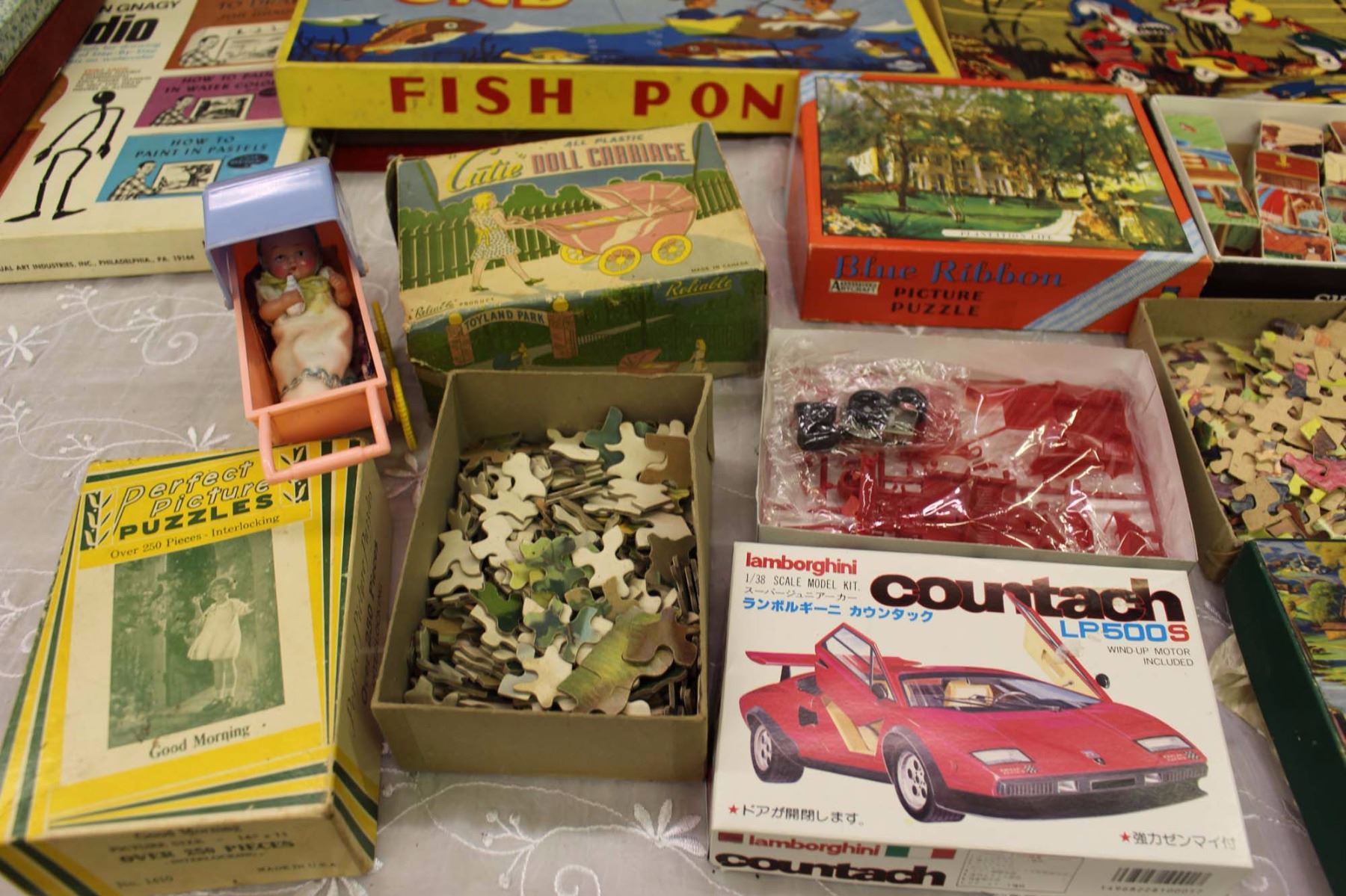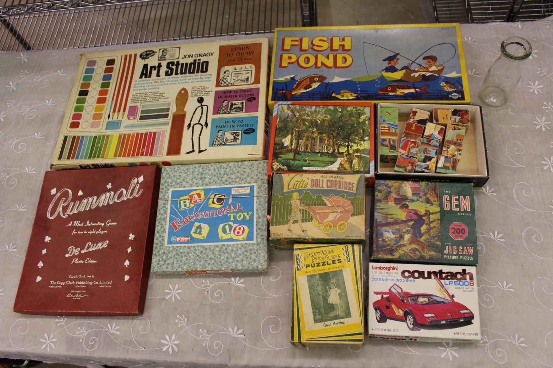 Lot of Vintage Puzzles& Toys w/Tote Container