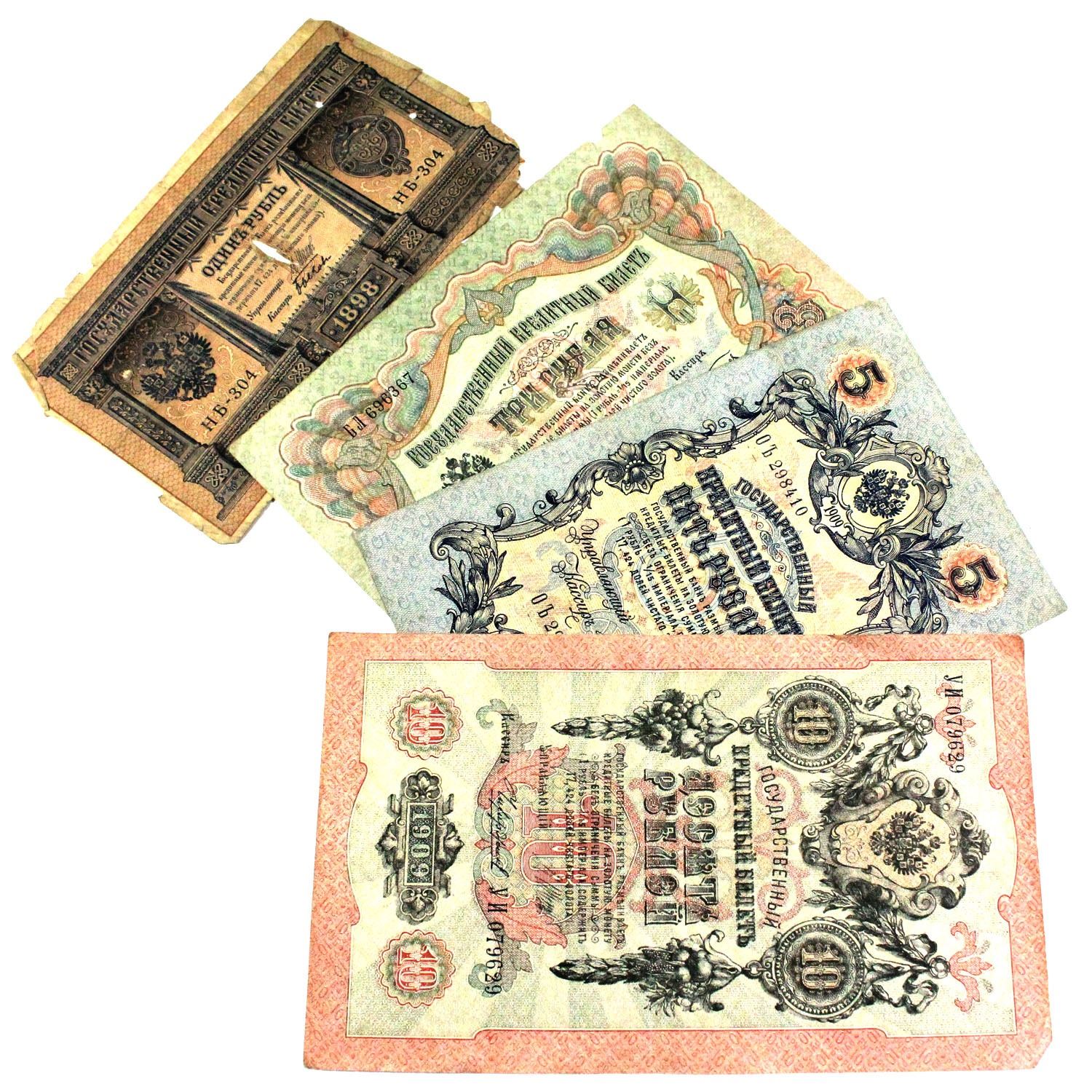Lot of Vintage Russia Banknotes. You will receive a 1898 1 Ruble, 1905 3 Ruble, 1909 5 Ruble & 1909 10 Ruble. 4pcs