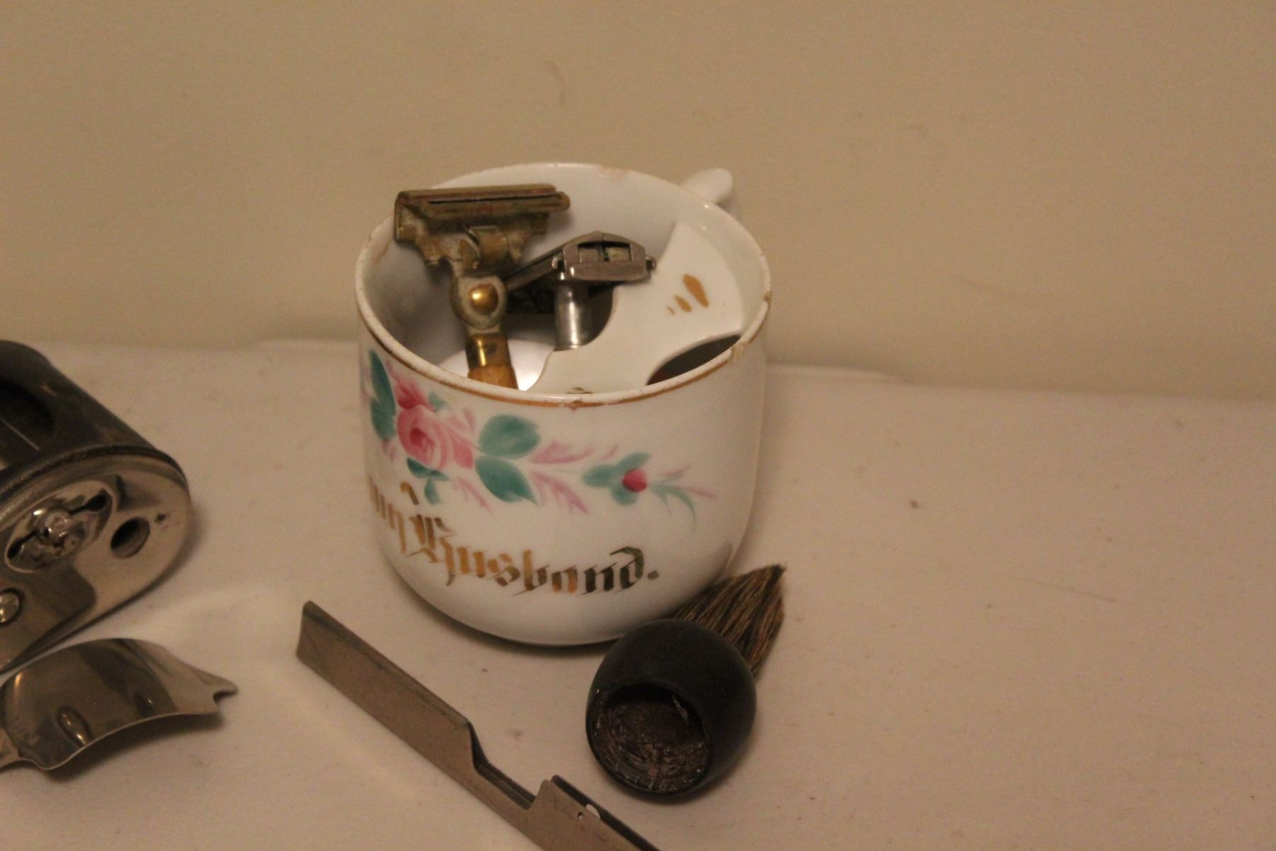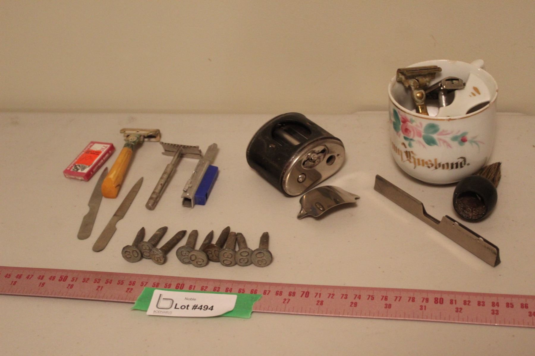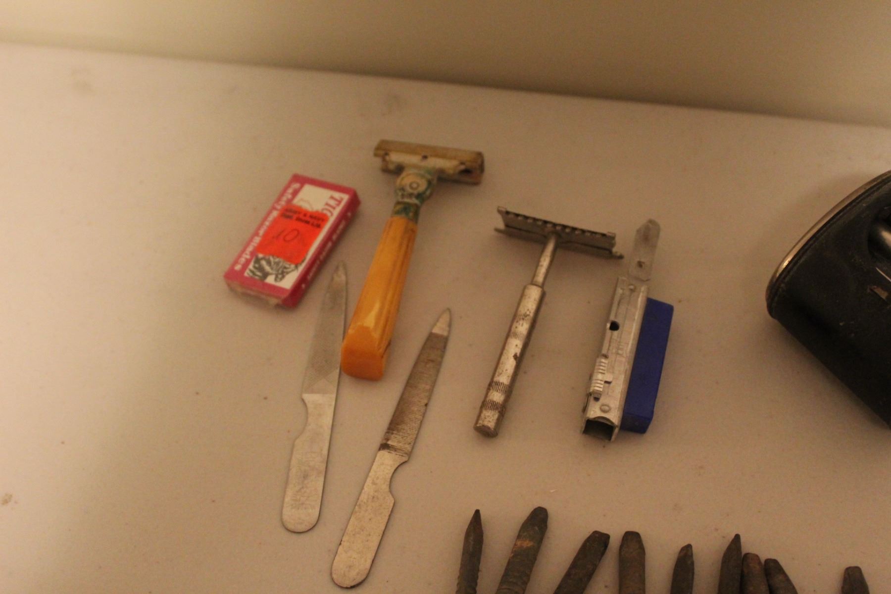 Lot of : Vintage Shaving Utensils, Numbered Railway Pole Date Nails