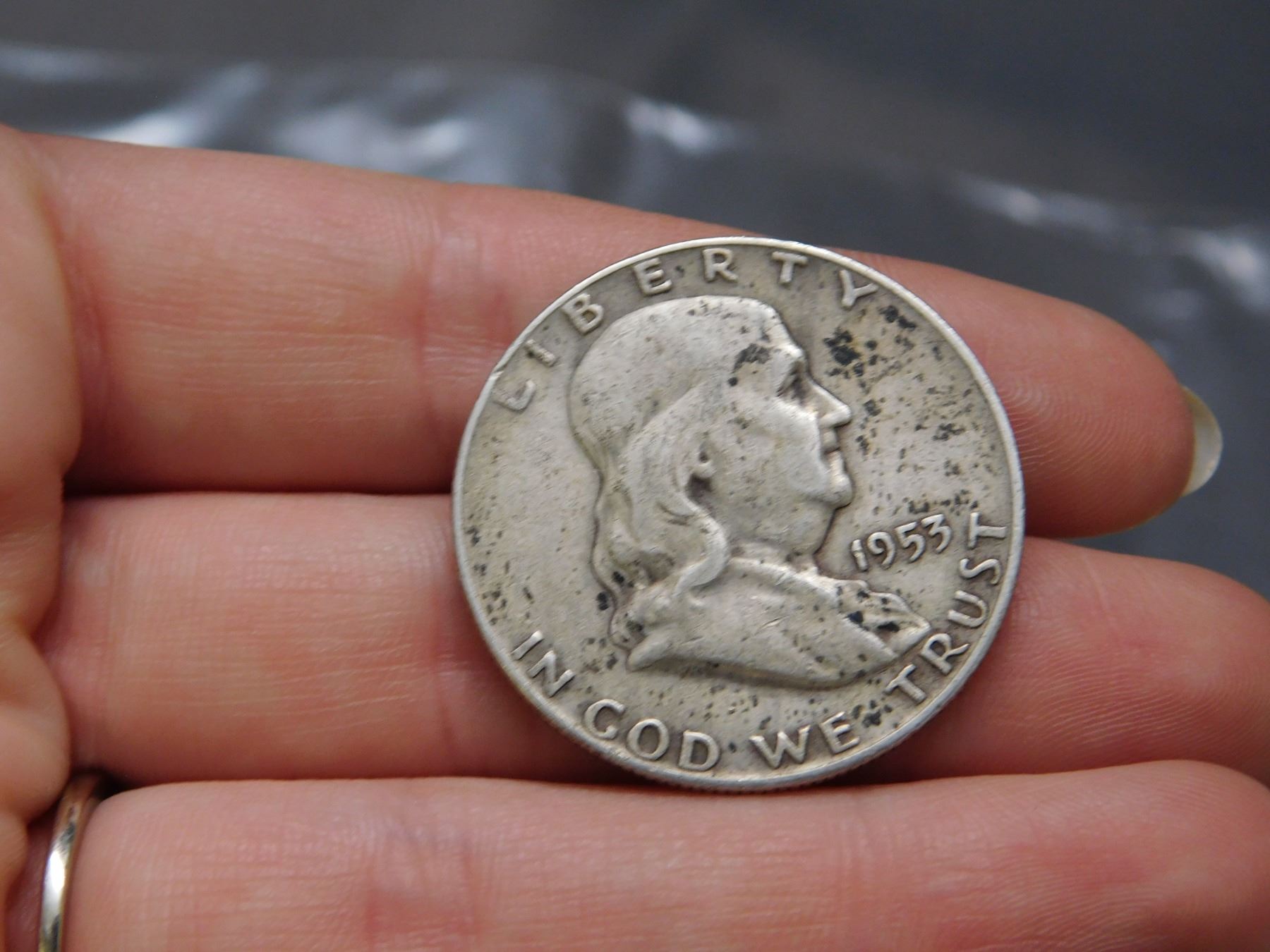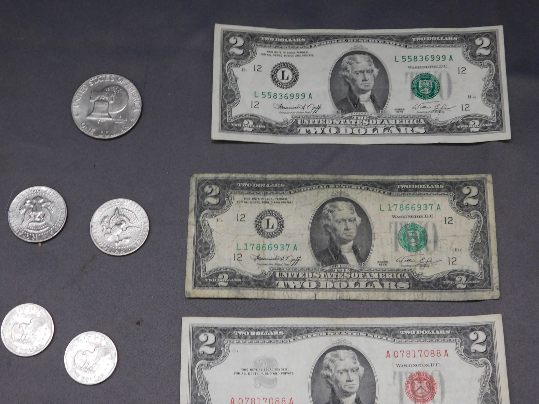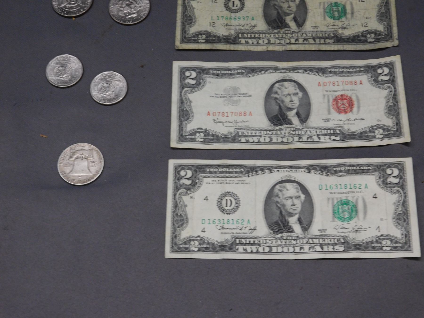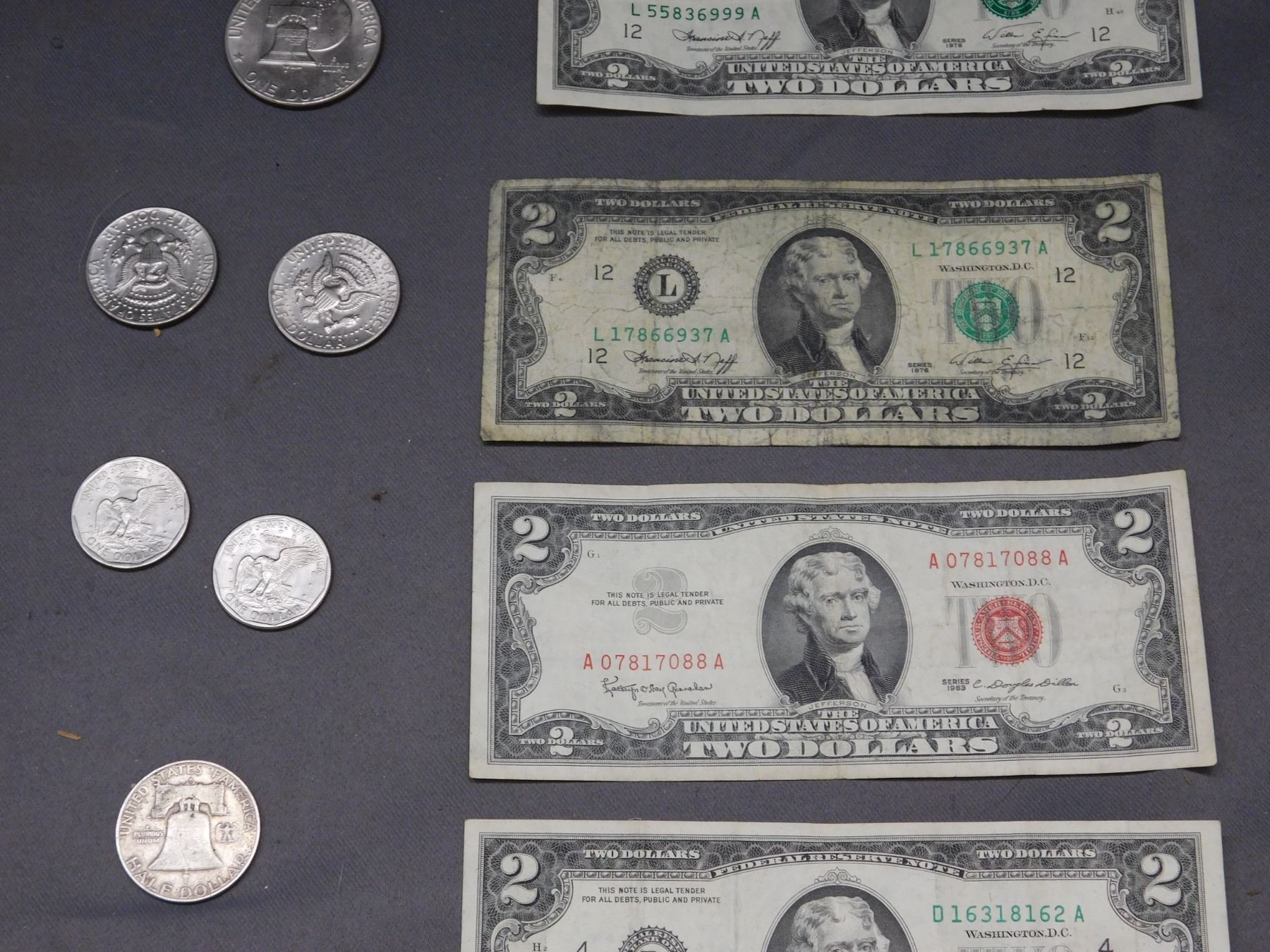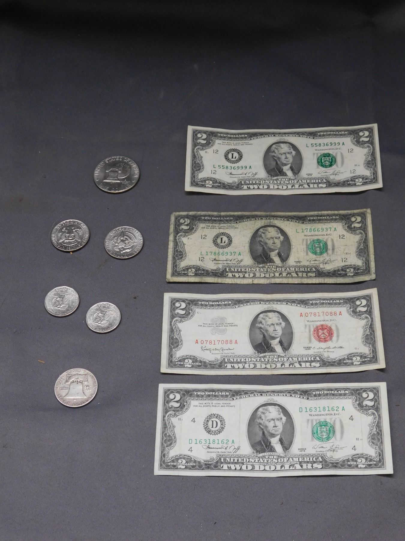 x4 $2 bills ranging from 1963, 1976, 1976, 1976 US dollar, 1971, 74 50c pieces, 1979 x2 dollars, x1 silver 1953 US 50c piece