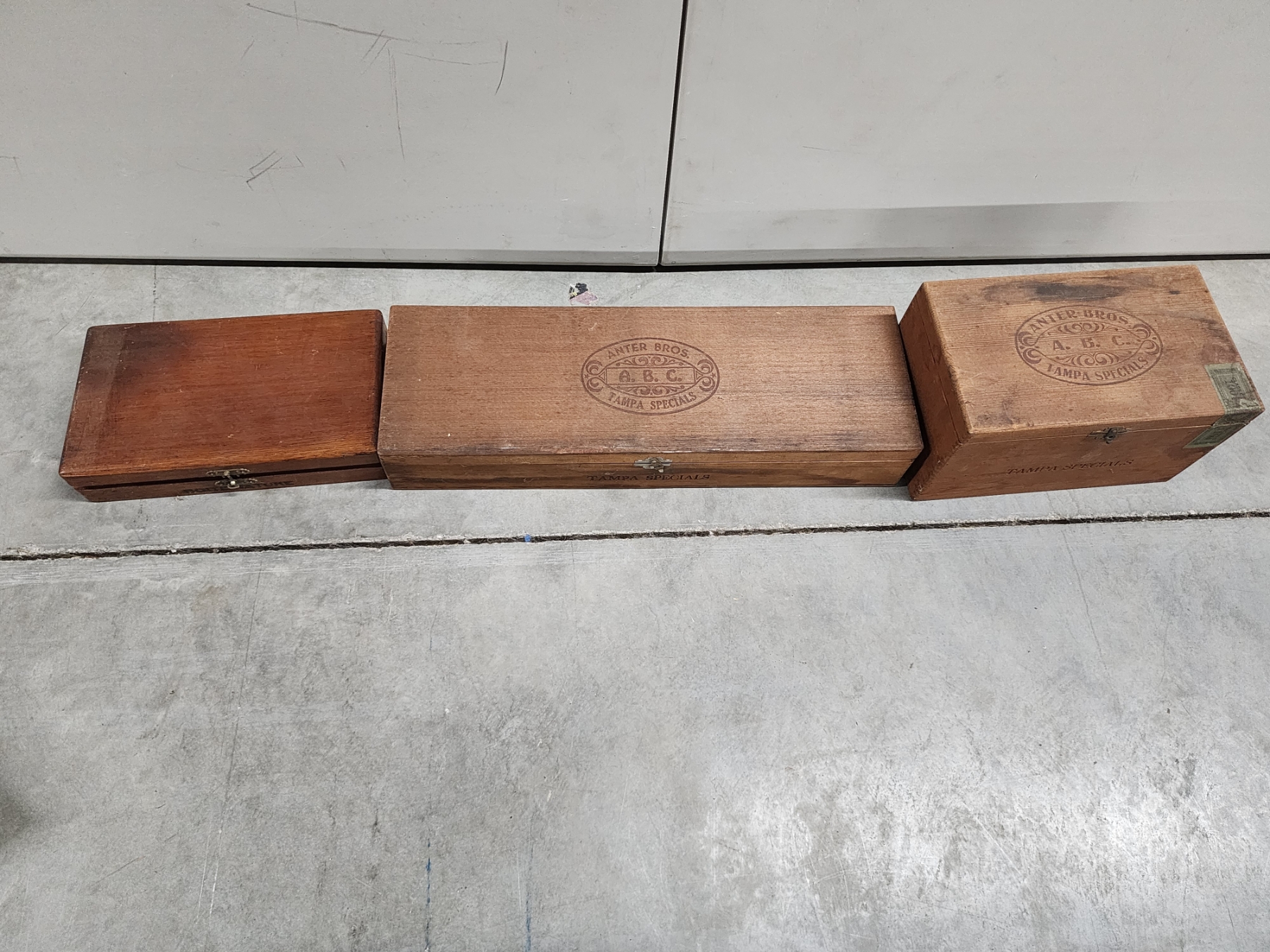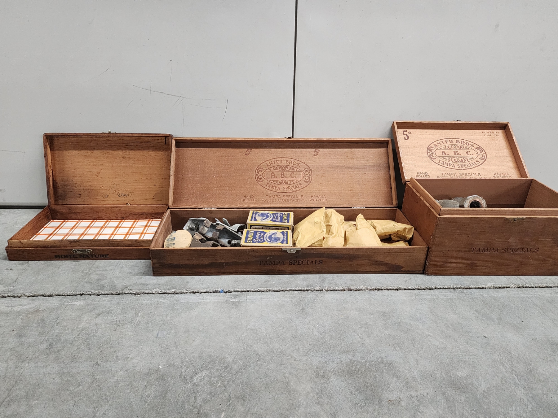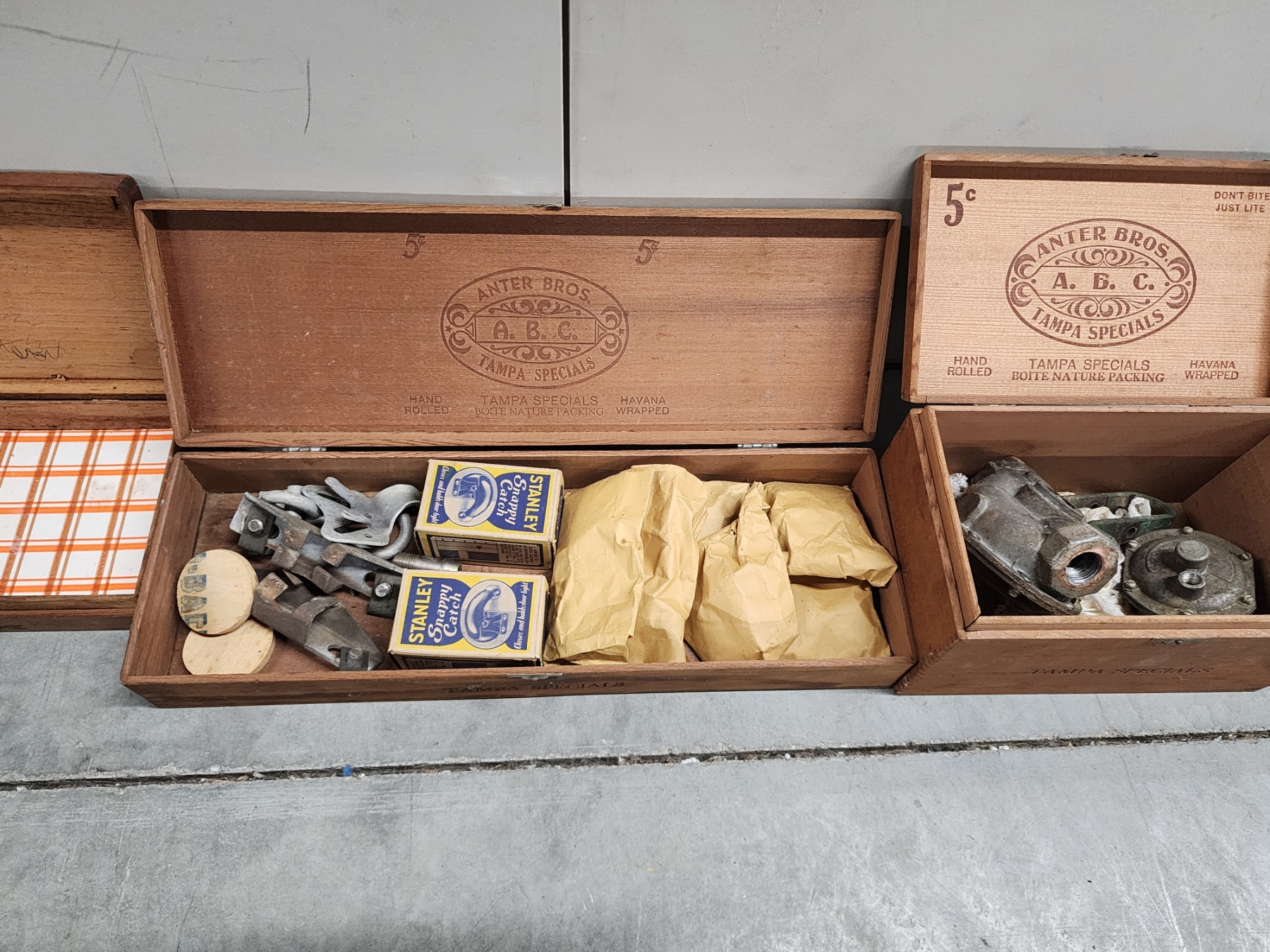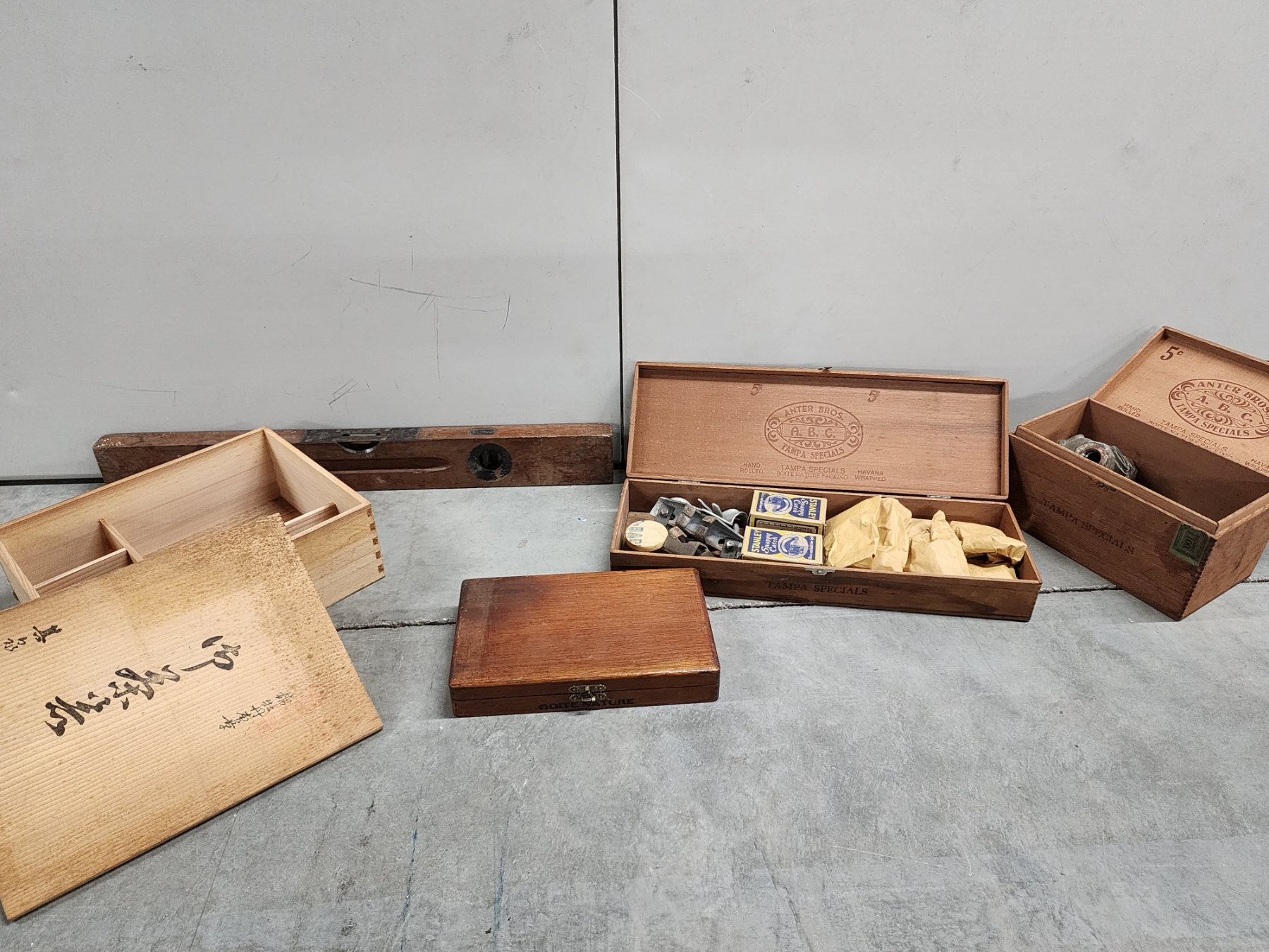 Lot of Vintage Wooden Boxes, Cigar Boxes, with Contents and Vintage Stanley Level