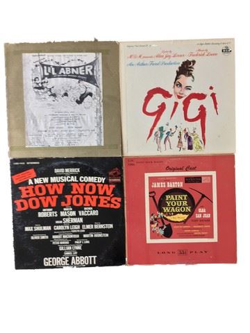 Collection of 10 vinyl records (12"x12"). Featuring original cast albums and priceless collections from various era and record labels, such as "Lil Abner" the original musical comedy, "How Now Dow Jones" a musical comedy by RCA Records, James Barton in "Paint Your Own Wagon", RCA Records, "Gigi", MGM Records, an original motion picture soundtrak "Doctor DoLittle", 20th Century Records, Cole Porter in "Kiss Me Kate" Columbia Records, Lerner and Loewe's "My Fair Lady" Diplomat Records, "Kismet", by Edwin Lester, Columbia Materworks, Alfred Drake and Patricia Morrison in "Kiss Me Kate" by Columbia Masterworks, the Broadway musical "La Cage" (1983), by Red Steal Digital.