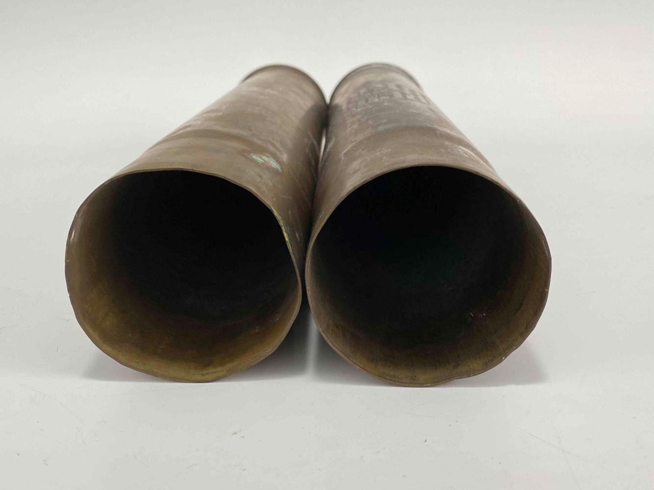 4 Pieces WWI Trench Art. Inscribed Reims 1918, Verdun 1918, Chateau Thiery 1918, And Argonne Forest 1918. Bottoms Marked Polte Magdeburg Febr 1916 367 Sp252. 75 DEC oPDs91L17P, PDPs 61 9 17. Approximately 13.75H x 3.375W. Approximately 4.75W x 3.625H in. Approximately 3.375H x 1.75W in
