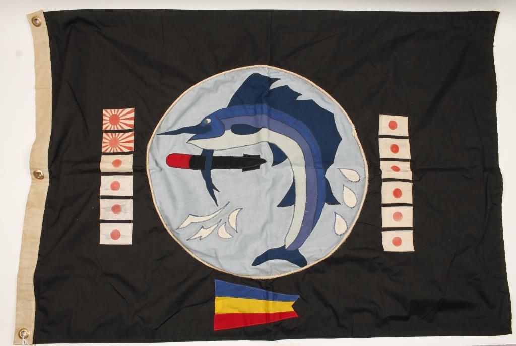 (1) USN 'USS Pike Fish' SS 303 Submarine Kill Flag. Measures 29 3/8" wide by 42 1/4" long. Multi piece machine sewn single sided cotton construction. (1) Japanese Ariska Combat Rifle Bayonet & Scabbard. Battle damaged. Measures 21 1/4" long overall. Part of the cross guard has been shot off. BONAZAI! Offered "as is", we don't guarantee the authenticity of this item, please do your research. All sales are final.